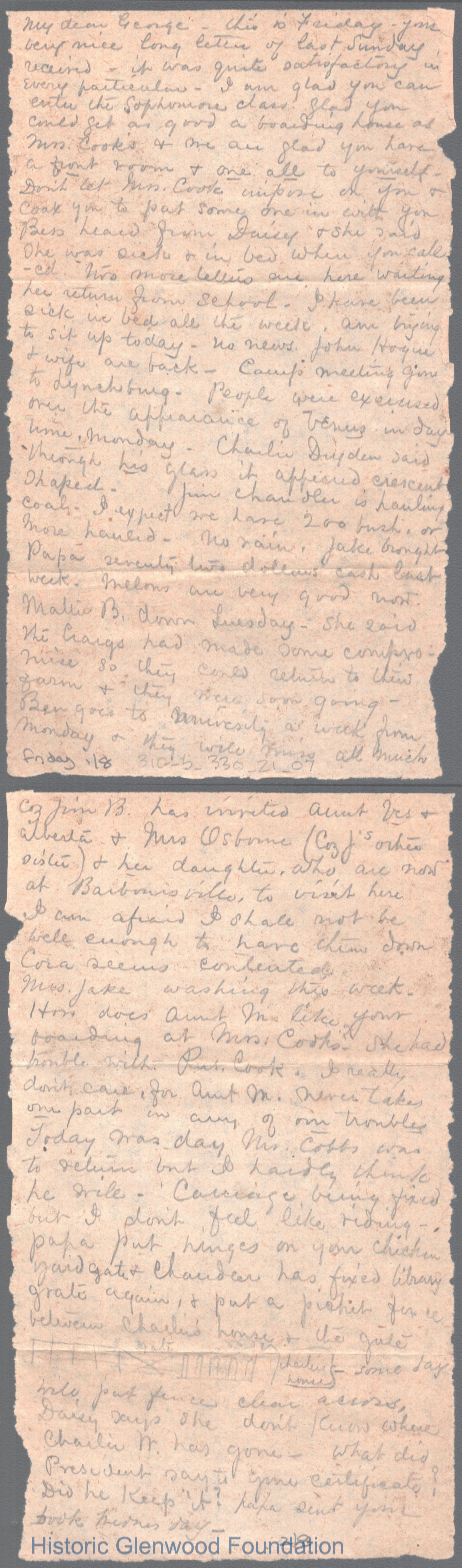 Eight-page letter to George W. Summers from his mother Lucy W. Summers, no date.