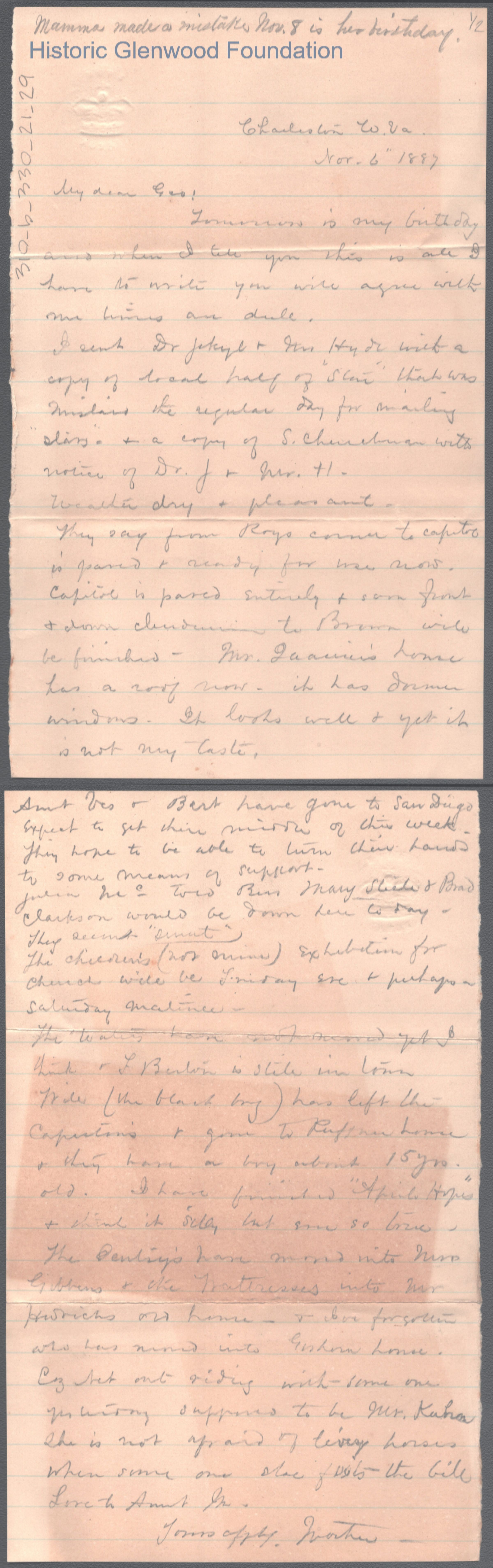 Two-page letter to George W. Summers from his mother Lucy W. Summers, Nov 6, 1887.