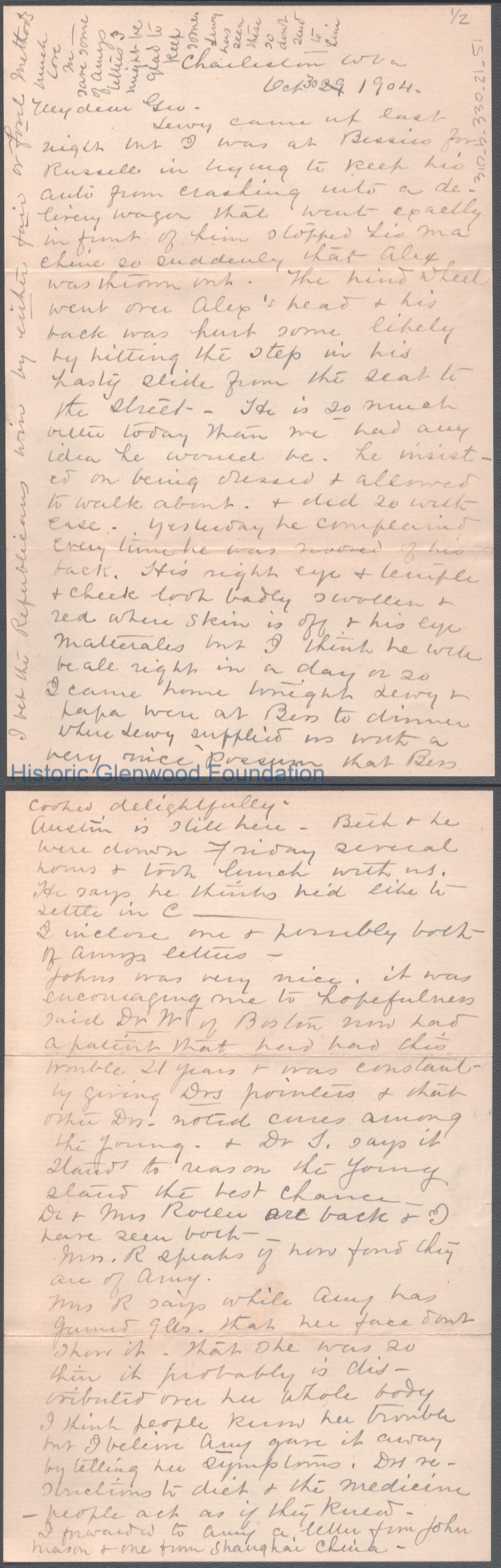 Two-page letter to George W. Summers from his mother Lucy W. Summers, Oct 30, 1904.
