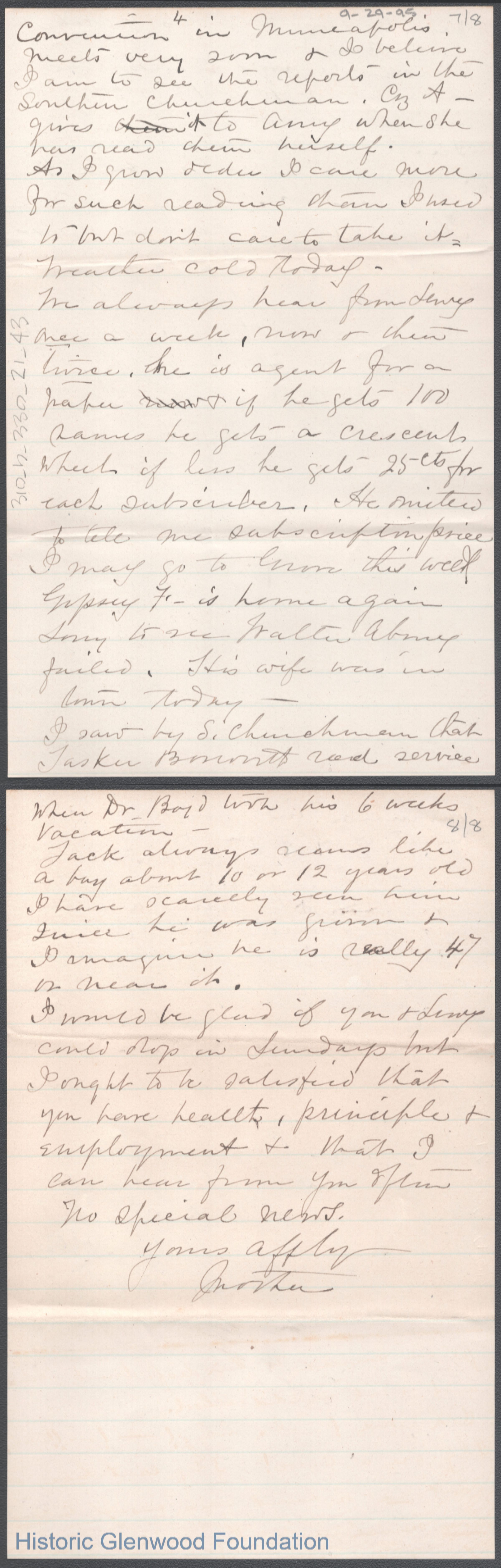 Eight-page letter to George W. Summers from his mother Lucy W. Summers, Sep 29, 1895.