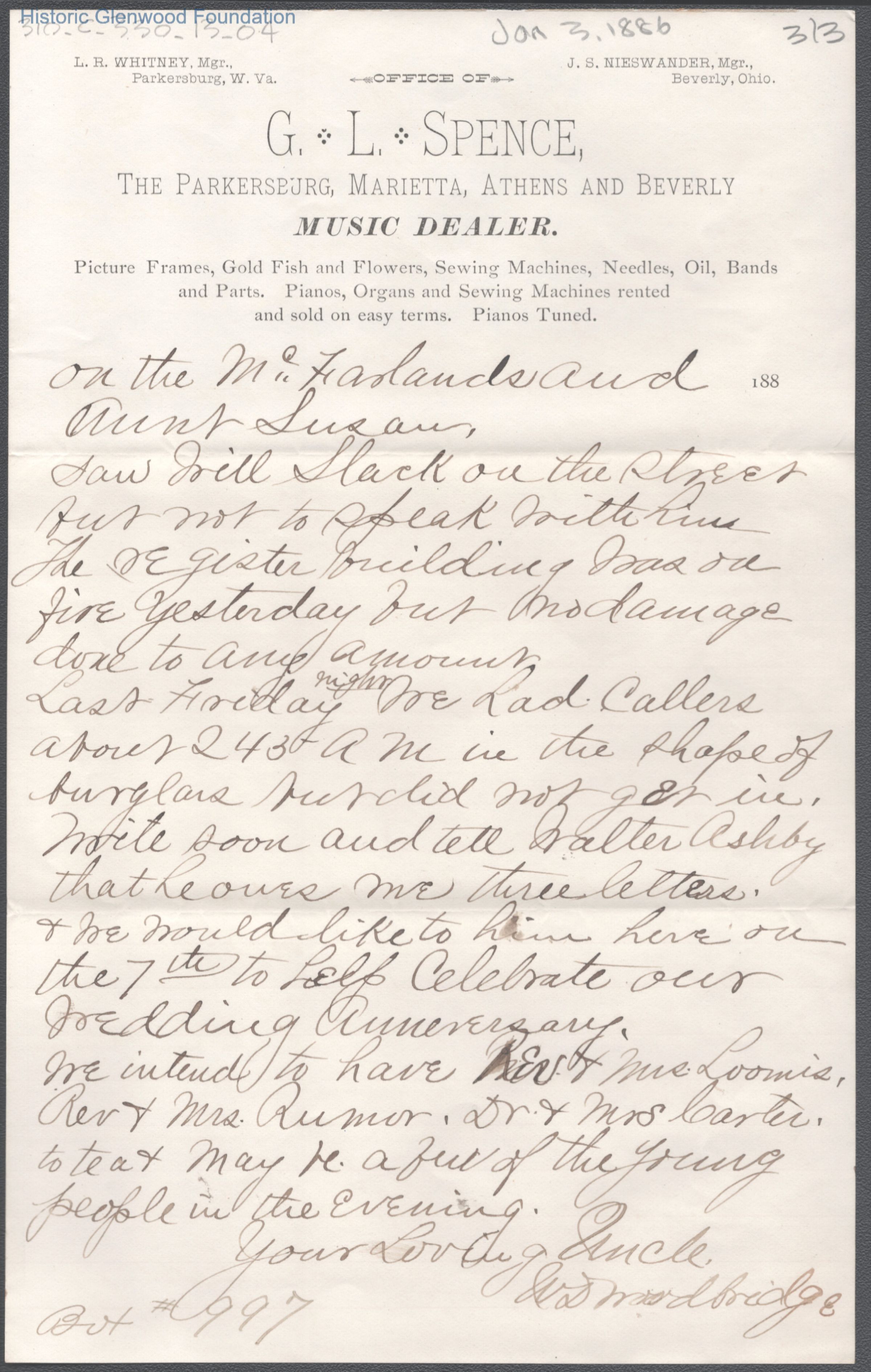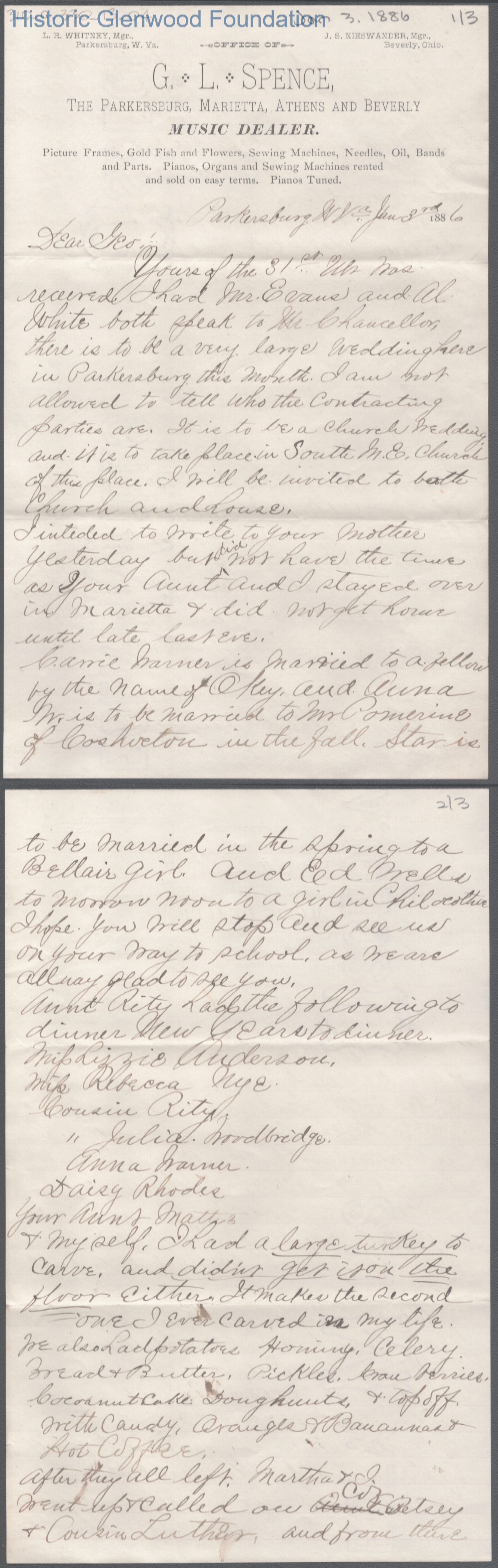 Three-page letter to George W. Summers from his uncle W. D. Woodbridge, Jan 3, 1886. Written on G. L. Spence letterhead.