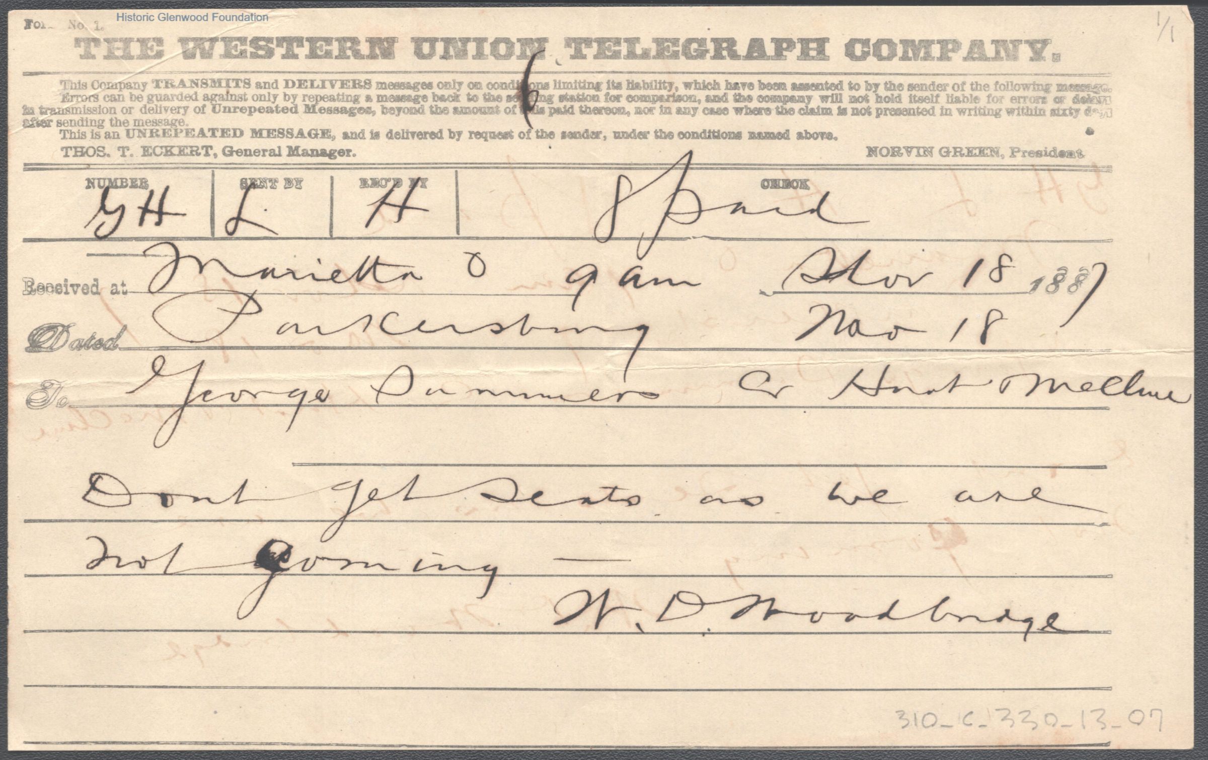Telegram to George W. Summers from his uncle W. D. Woodbridge, Nov 18, 1887.