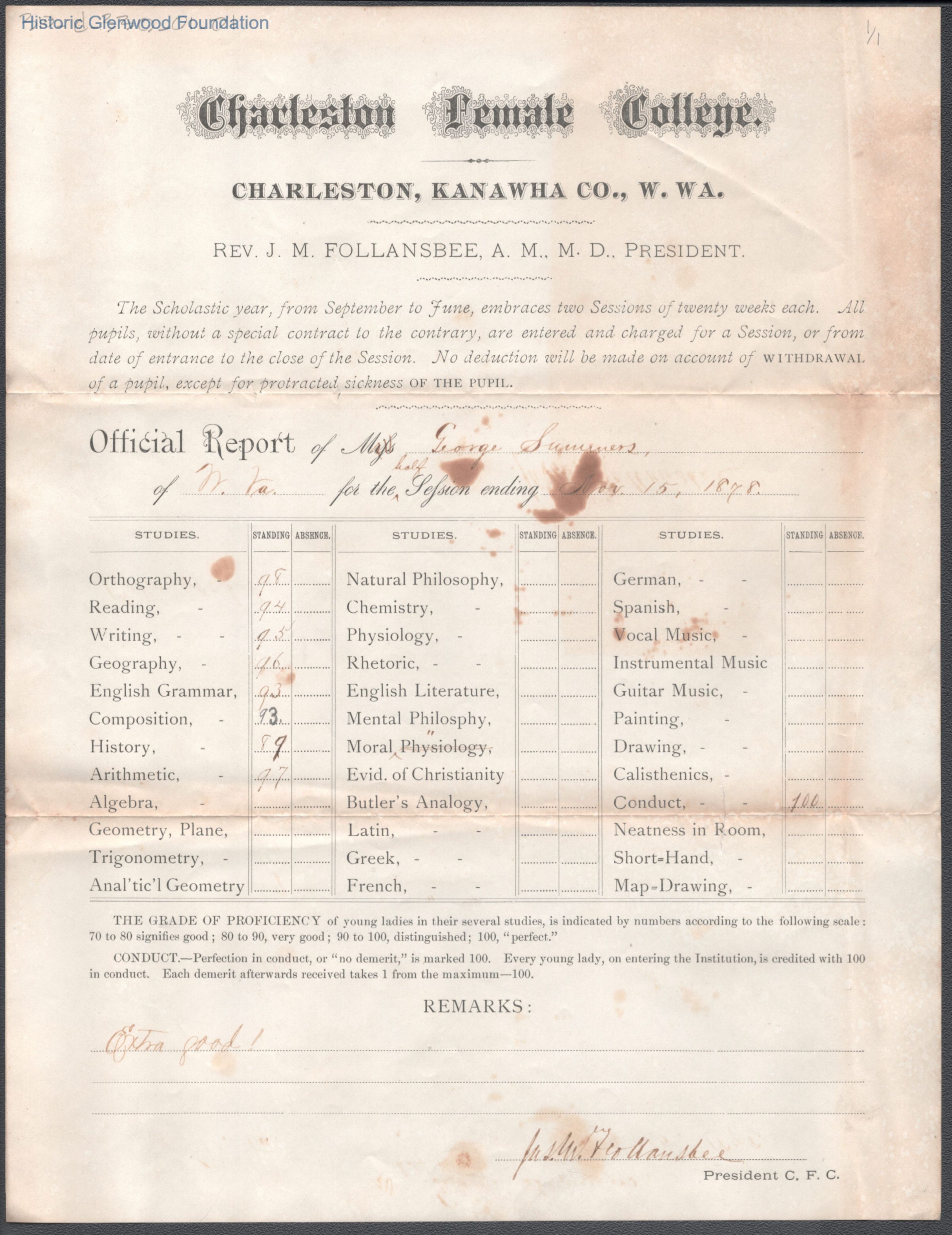 George W. Summers, Progress Report, Charleston Female College, May 15, 1878