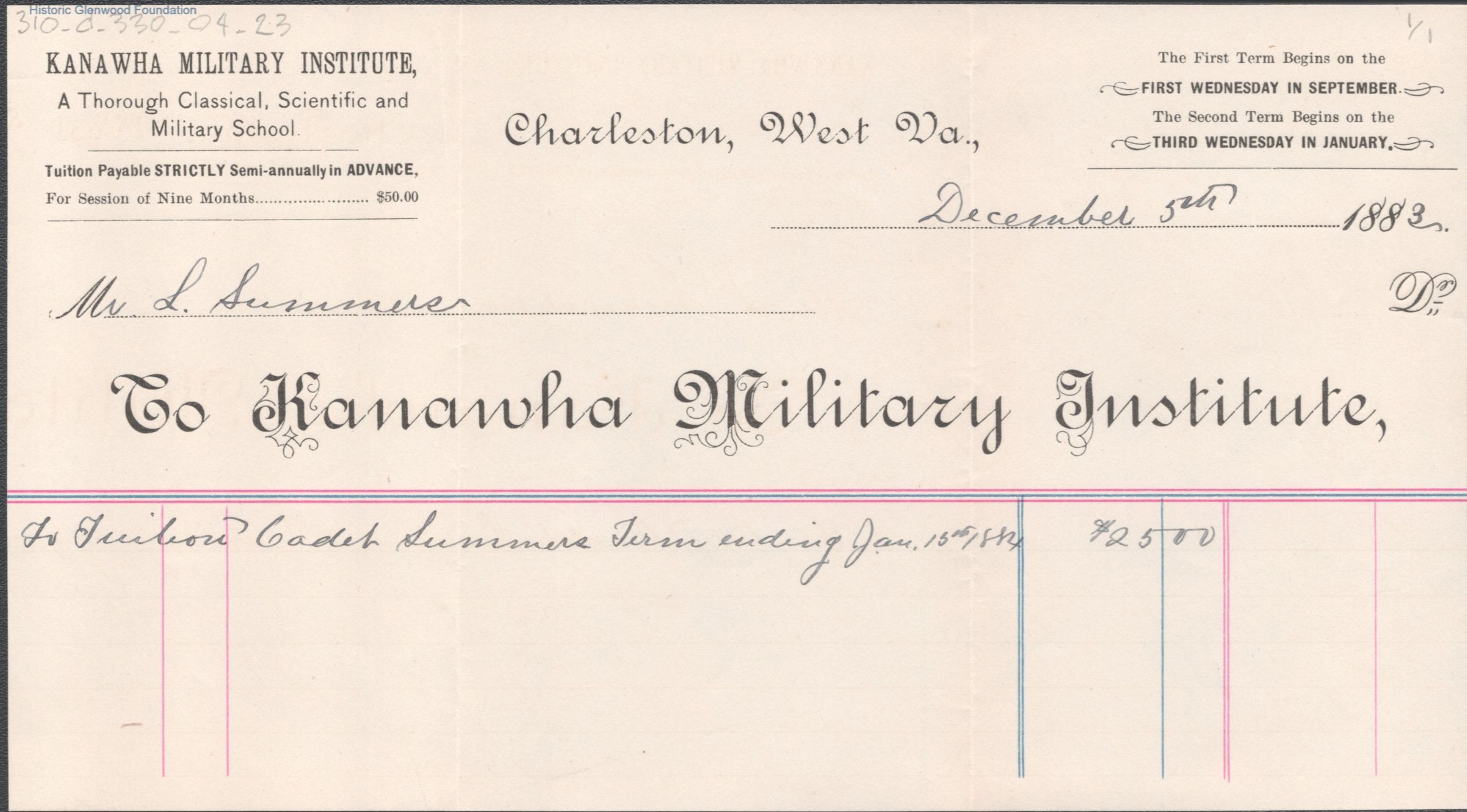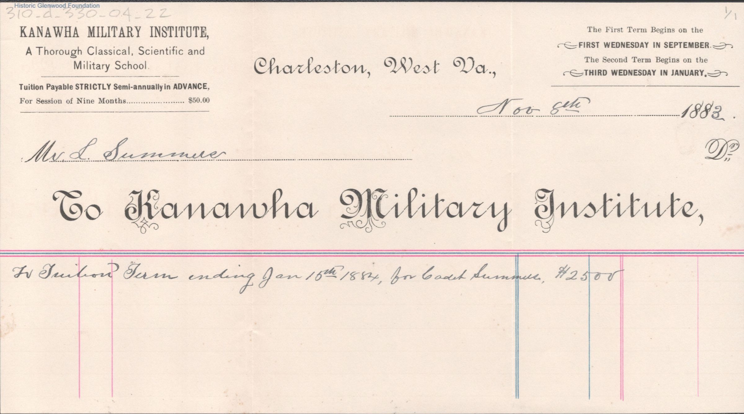George W. Summers, Tuition Statements, Kanawha Military Institute