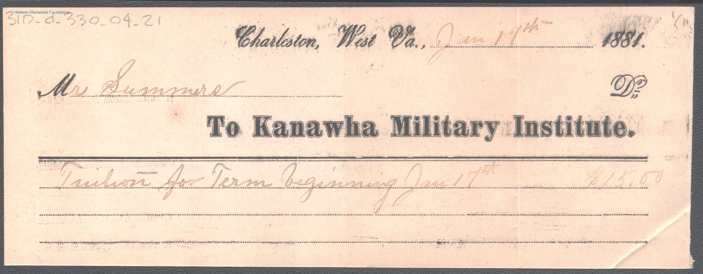 George W. Summers Tuition statements, Kanawha Military Institute