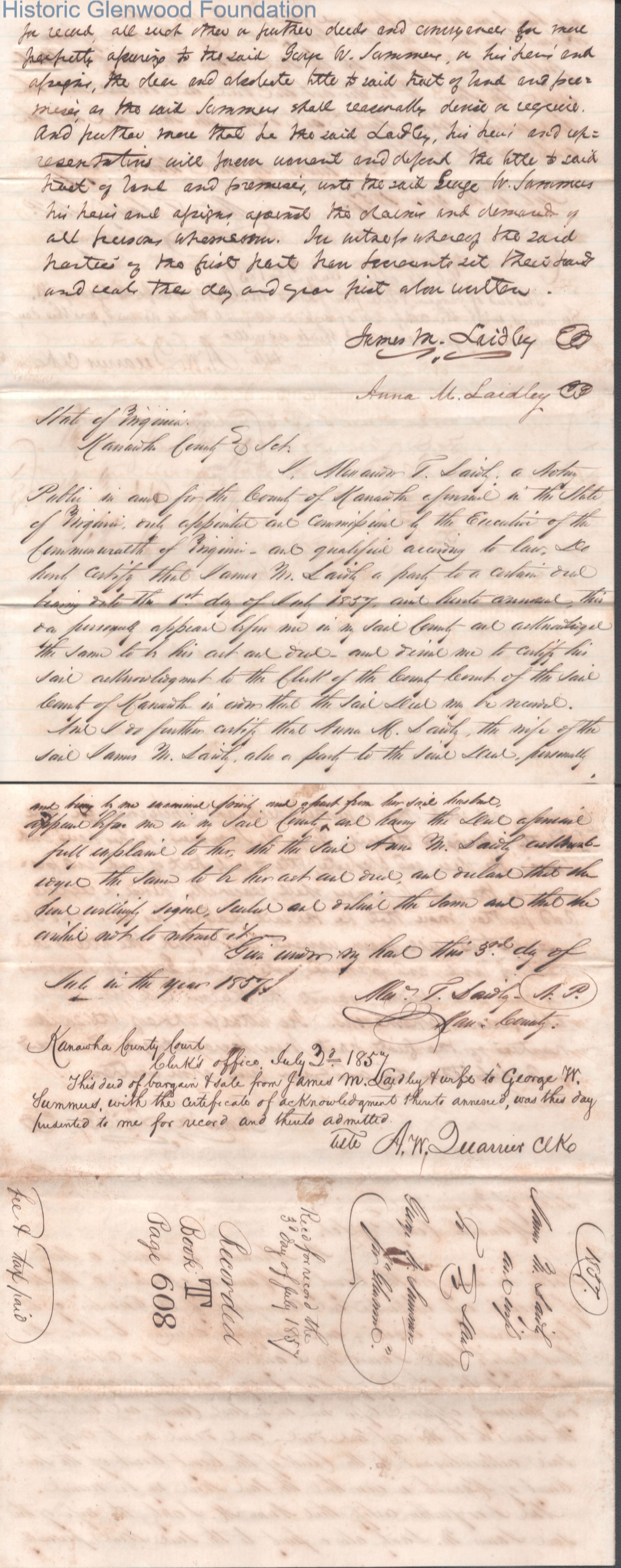 Glenwood Purchase Agreement between Judge George Summers and James M. Laidley and Anna M. Laidley, Jul 1, 1857.