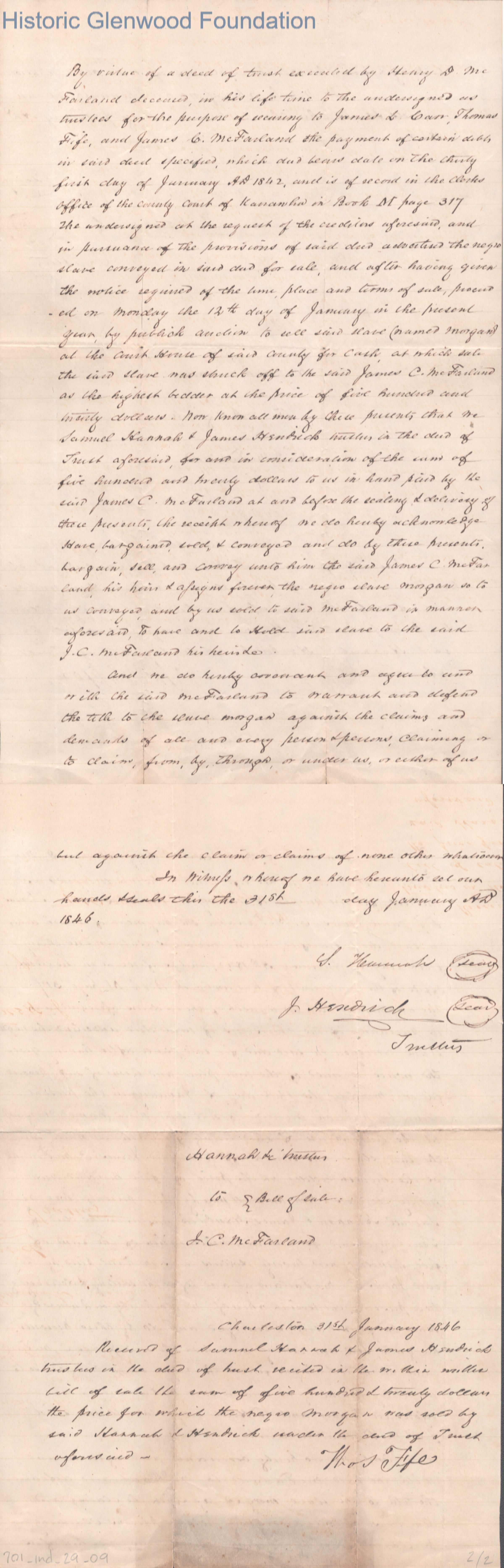 James C. McFarland slave purchase from J. Hendrick and S. Hannah, dated Jan 31, 1846.