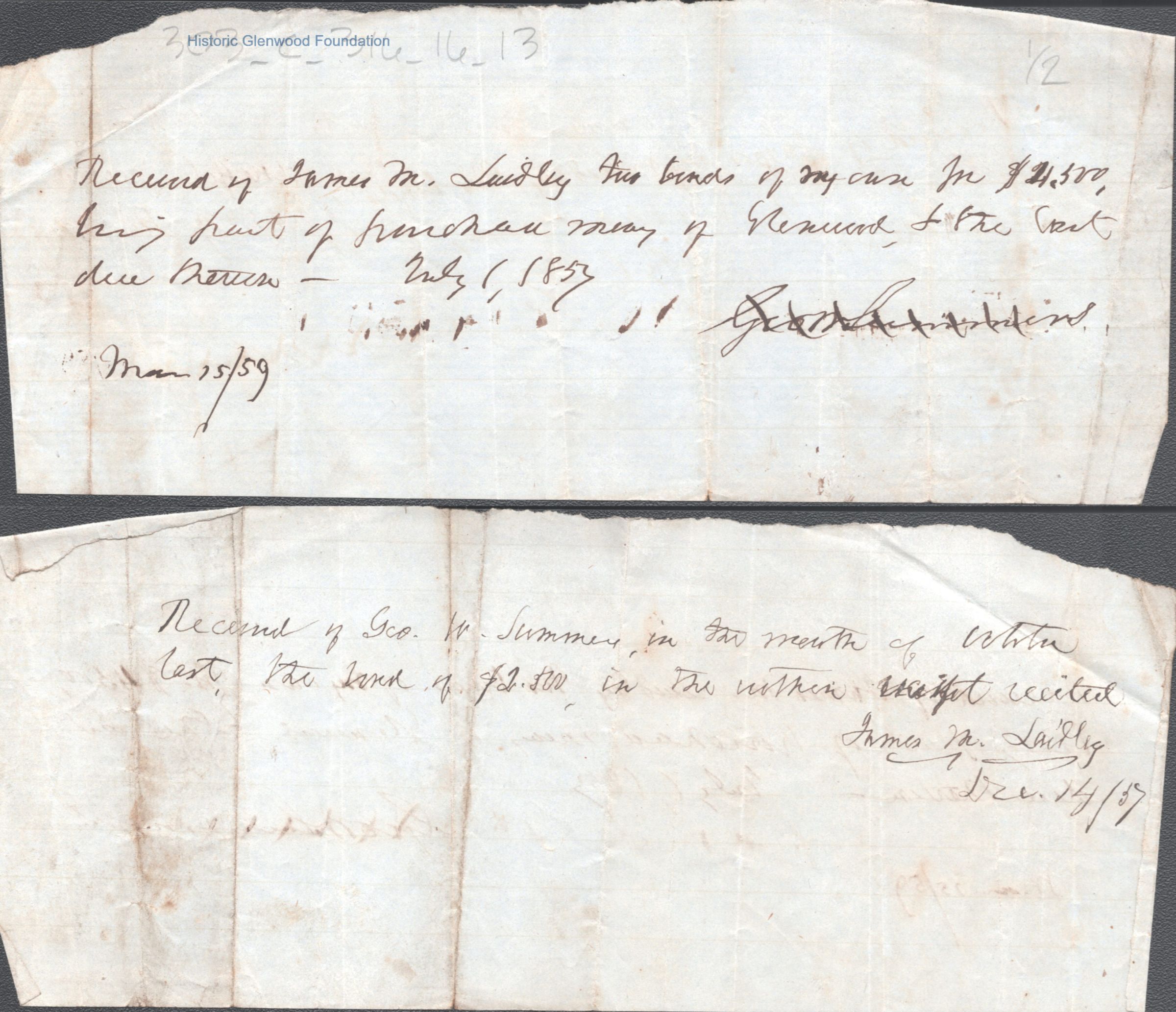 James M. Laidley and Judge George Summers Receipts for Glenwood Purchase Payments, Dec 14, 1857, Mar 15, 1859