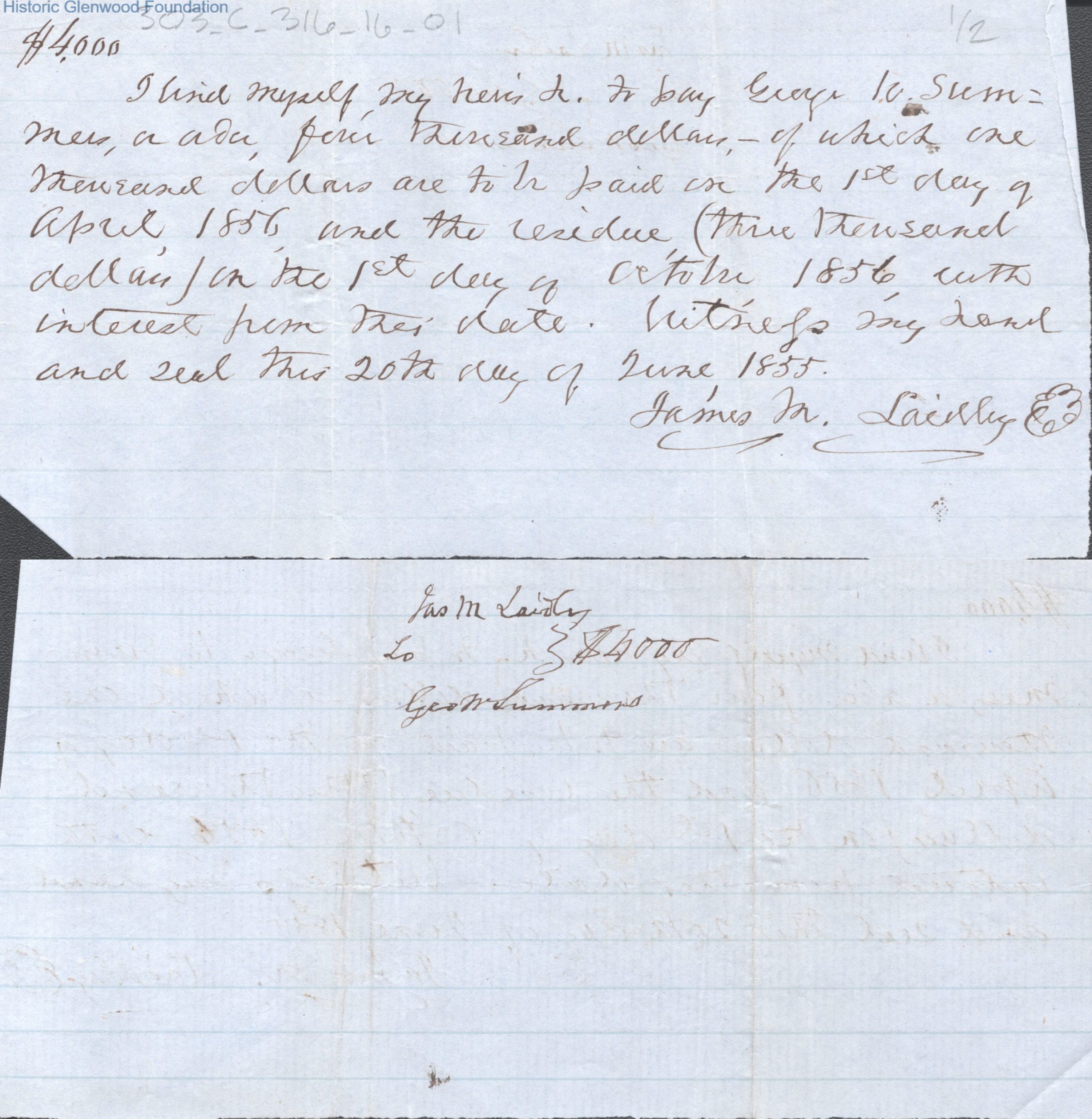 James M. Laidley promissory note for $4000 to Judge George Summers, Jun 20, 1855.