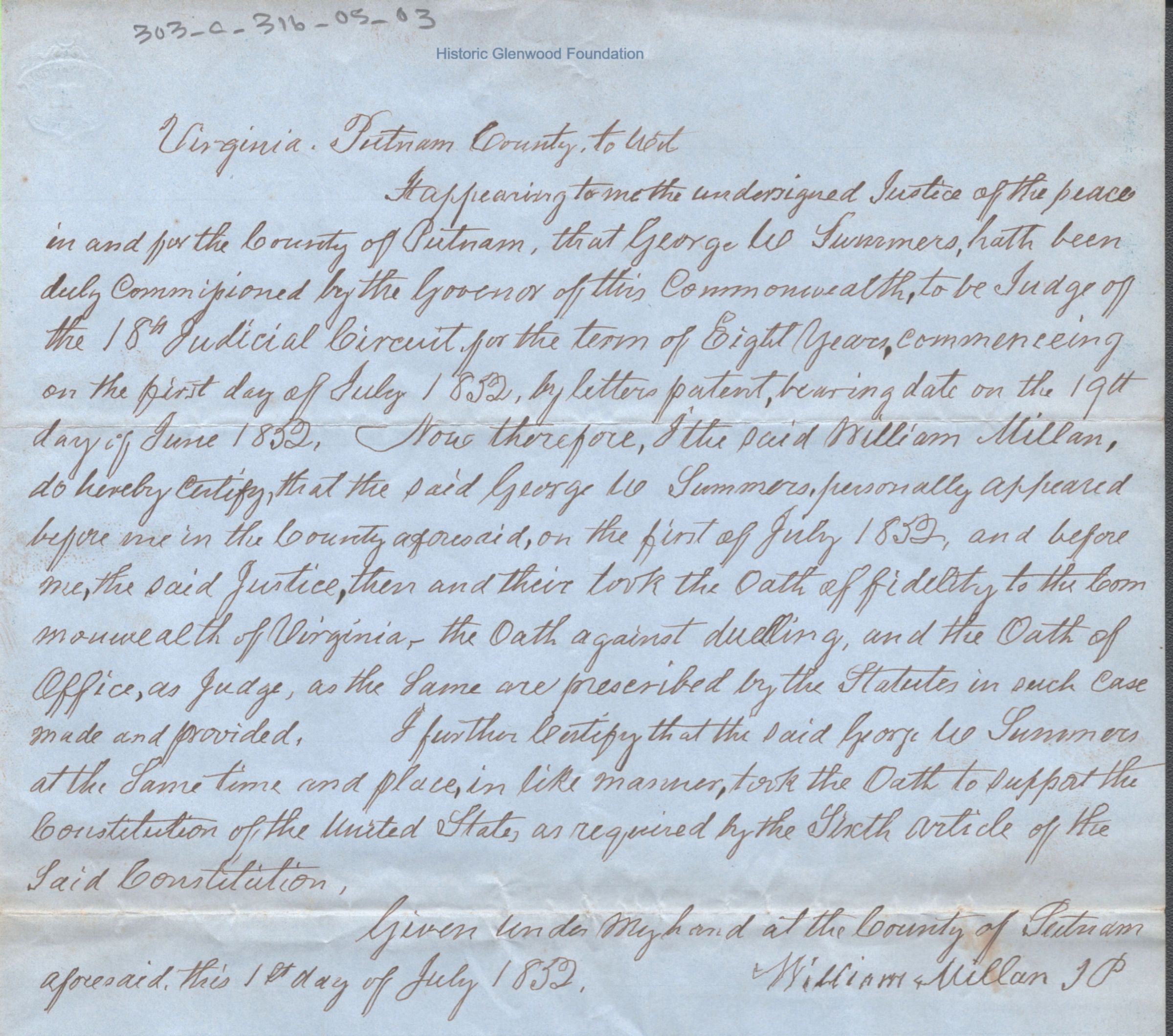 A handwritten certification by William Millan, Justice of the Peace for Putnam County, confirming that George W. Summers was officially sworn into office on July 1, 1852. The document notes that Summers took the required oaths of fidelity, the oath against duelling, the oath of office, and the oath to support the U.S. Constitution.Date(s) of Creation