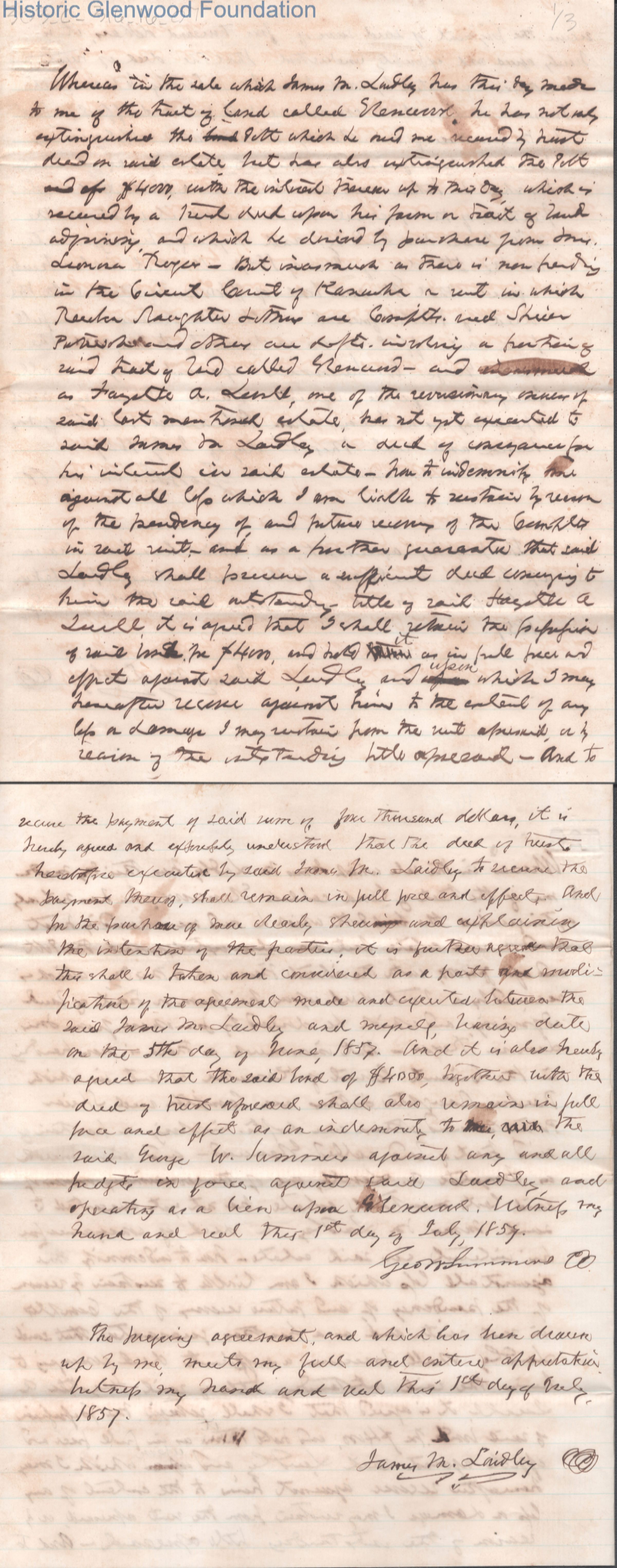 Judge George Summers and James M. Laidley agreement about Glenwood purchase payments, dated Jul 1, 1857.