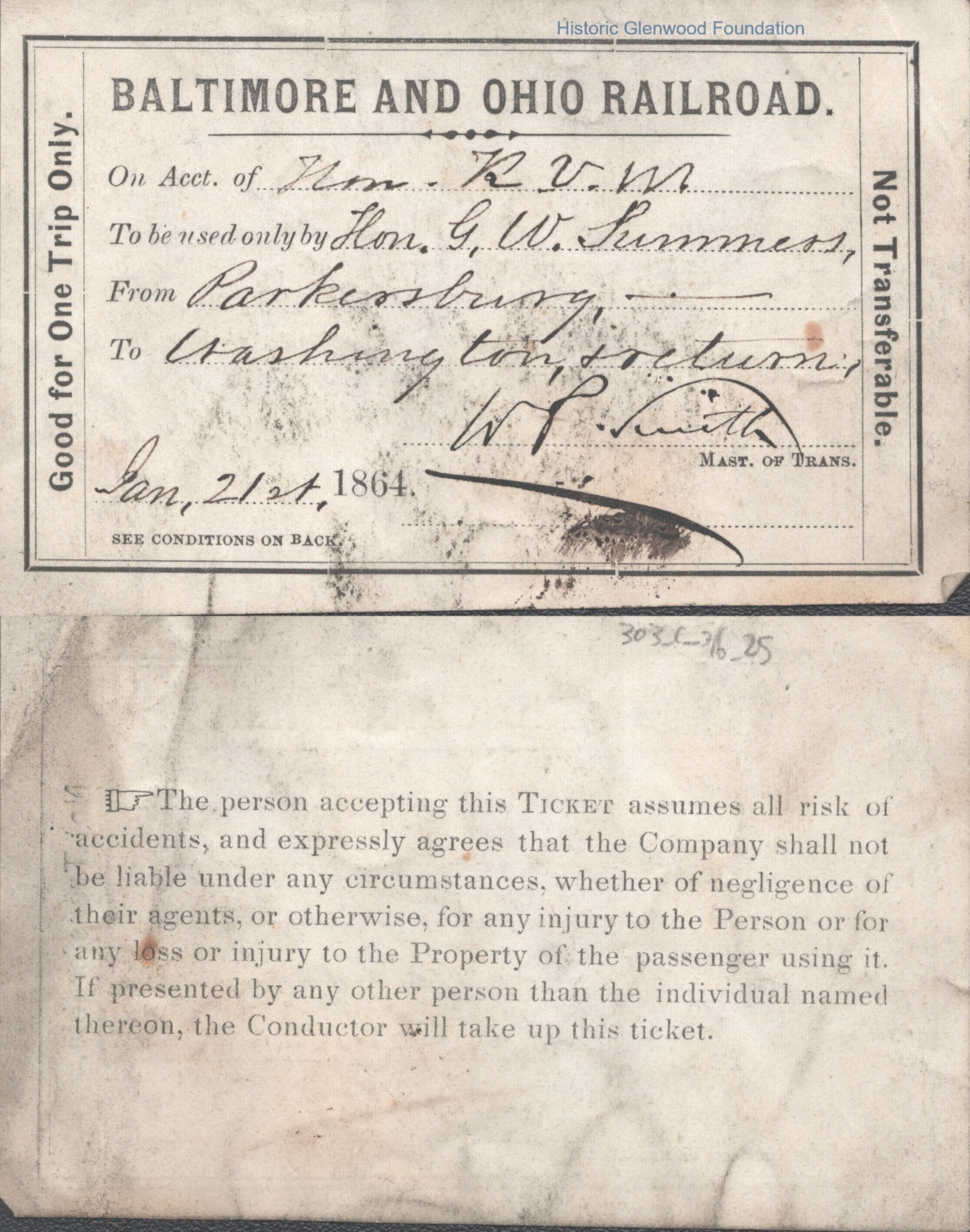 A printed railroad ticket for a round trip between Parkersburg and Washington. The ticket is made out to "Hon. G. W. Summers" and is signed by W. P. Smith, Master of Transportation. The reverse side contains a standard liability disclaimer. This item documents Summers’ travel during the Civil War, likely for political or legal business in the national capital.Date(s) of Creation