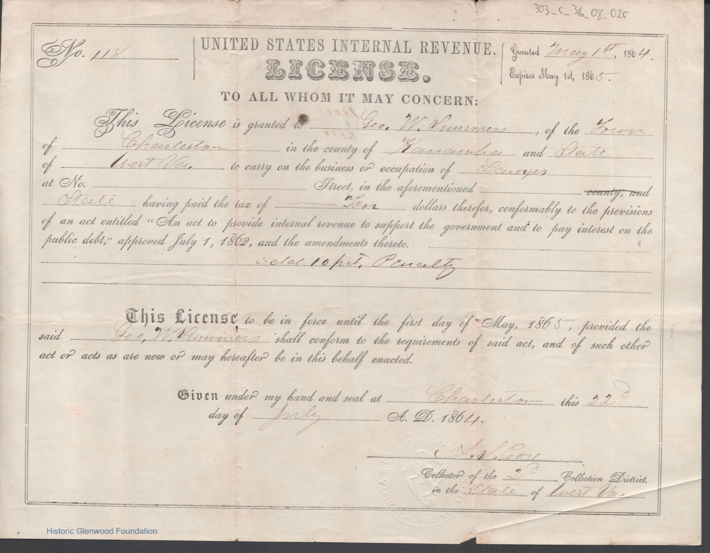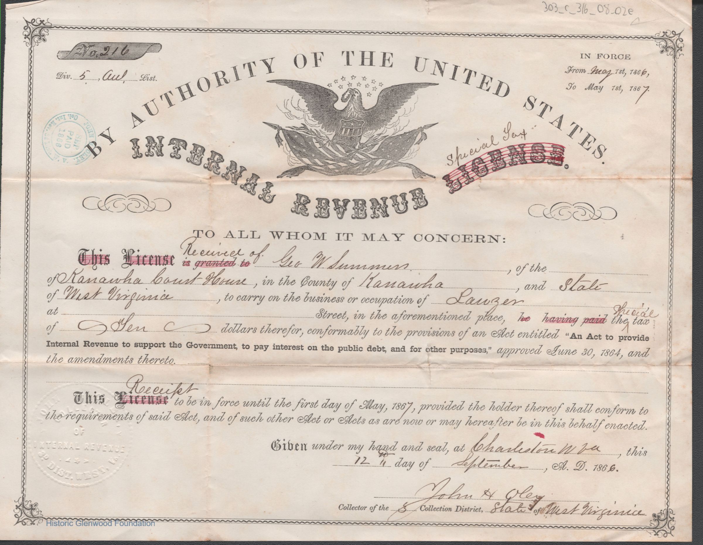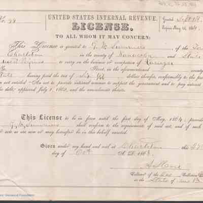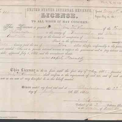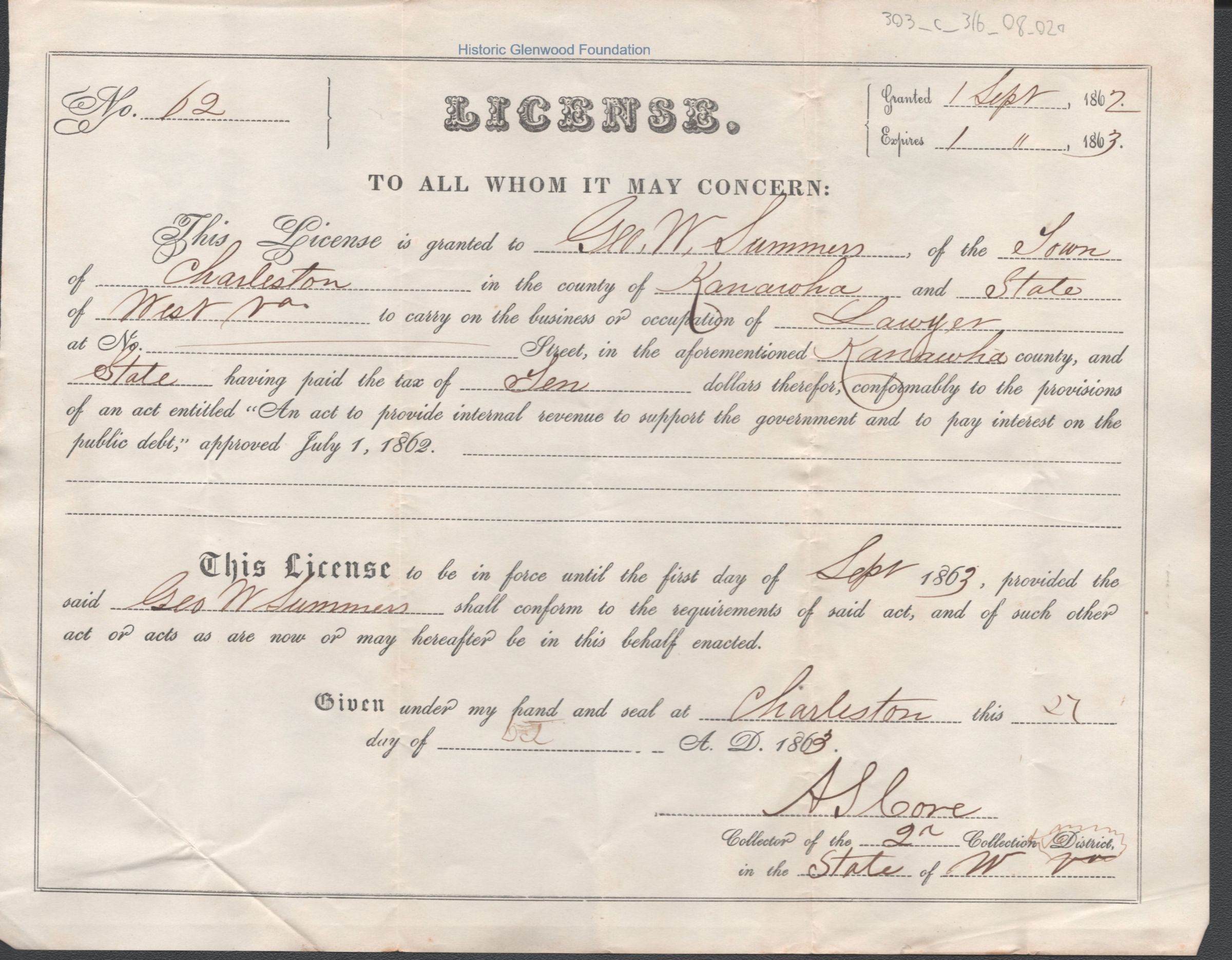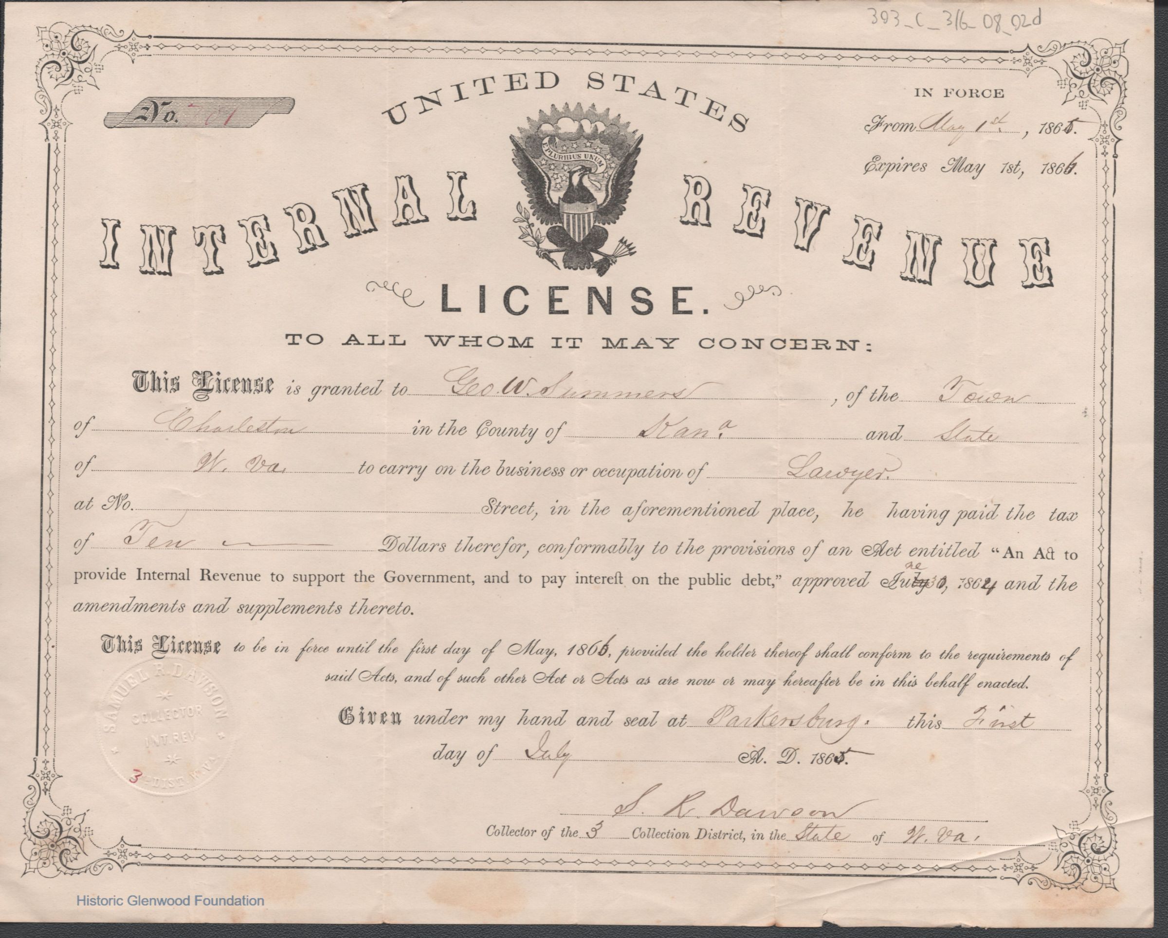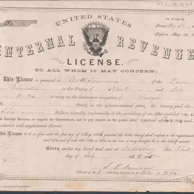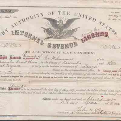 Federal internal revenue license issued to George. W. Summers of Charleston, Kanawha County, West Virginia, authorizing him to practice law upon payment of an occupational tax.Date(s) of Creation