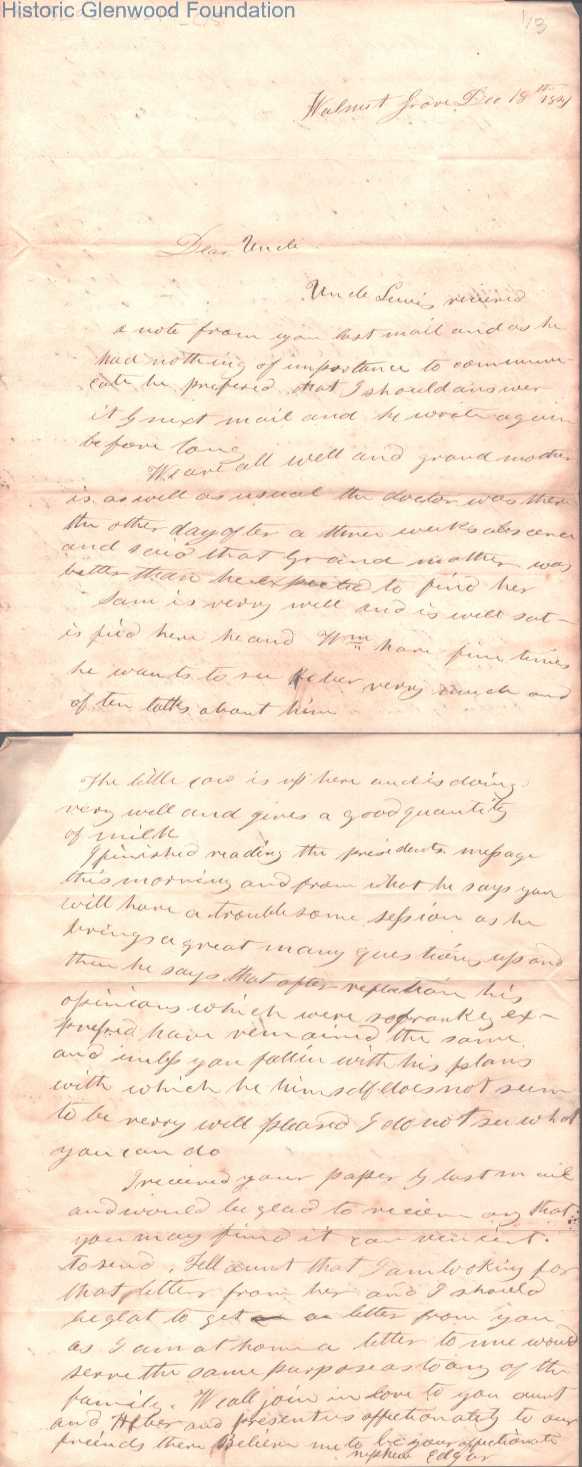 Two-page letter to Judge George Summers from newphew A. E. Summers, Dec 18, 1842.