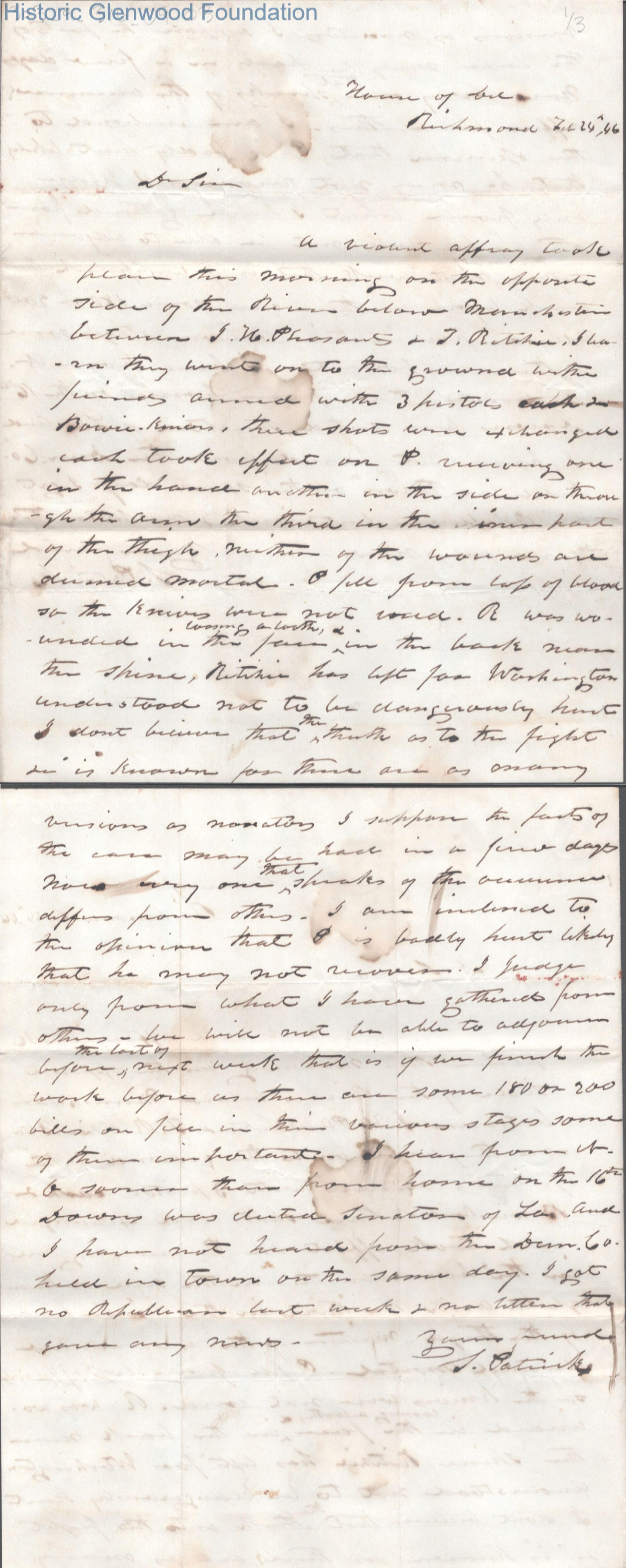 Two-page letter to Judge George Summers from Dr. Spicer Patrick, Feb 24, 1846.