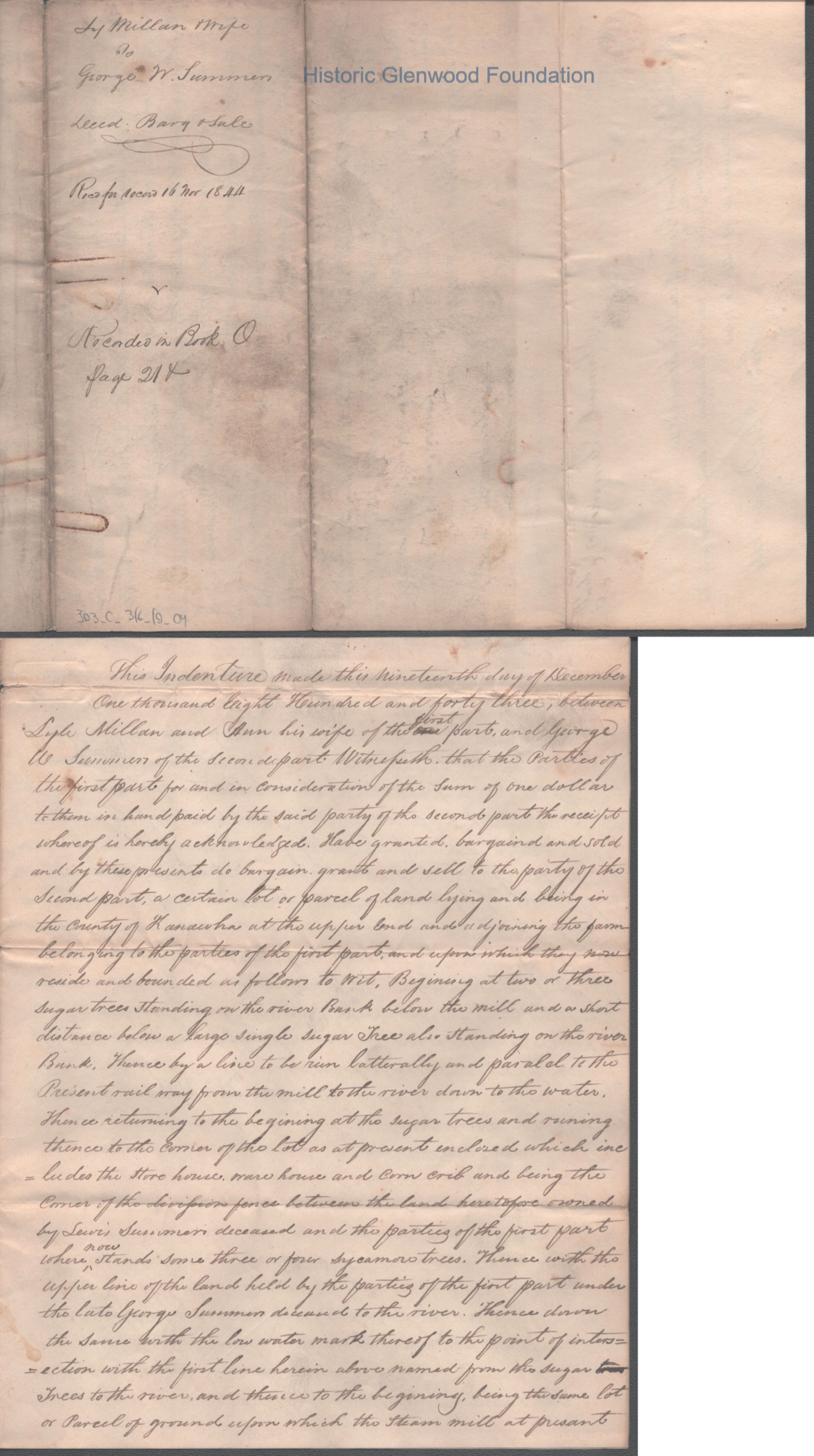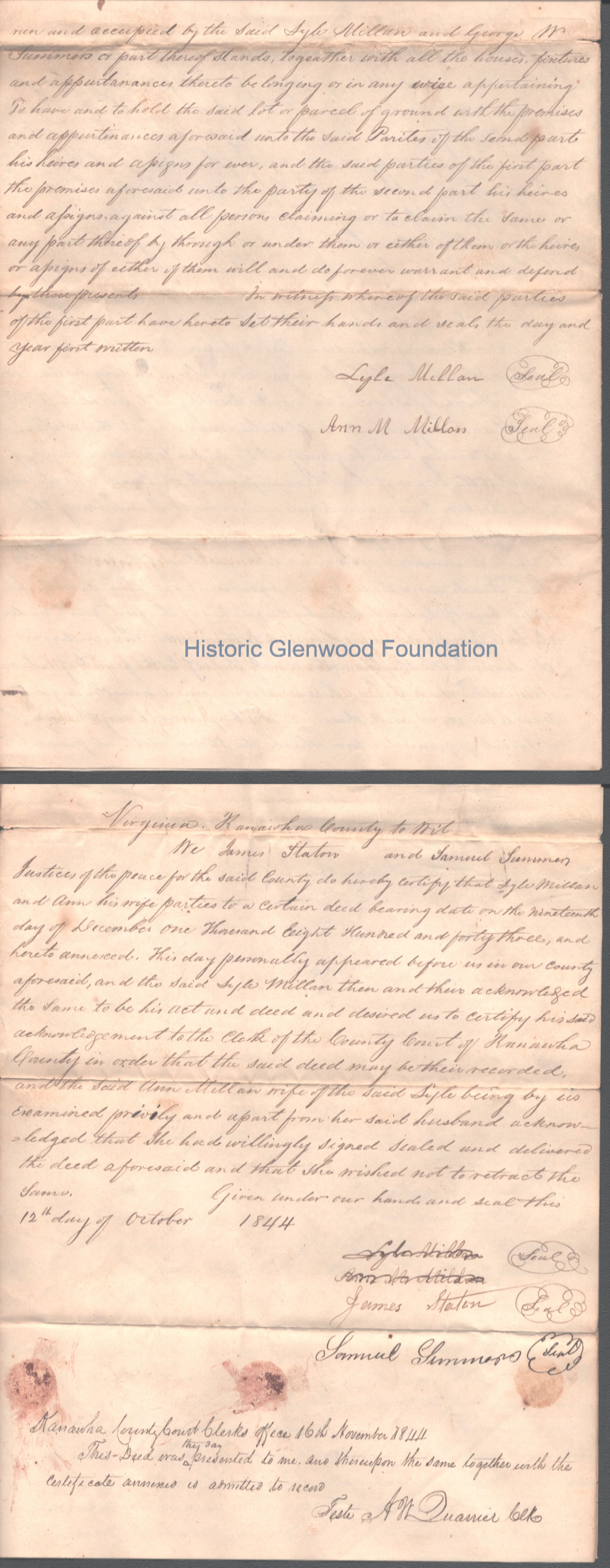 A formal two-page deed recording the sale of a commercial lot in Kanawha County from Lyle and Ann Millan to George W. Summers for one dollar. The property is located along the Kanawha River and includes a steam mill, storehouse, warehouse, and corn crib.Date(s) of Creation