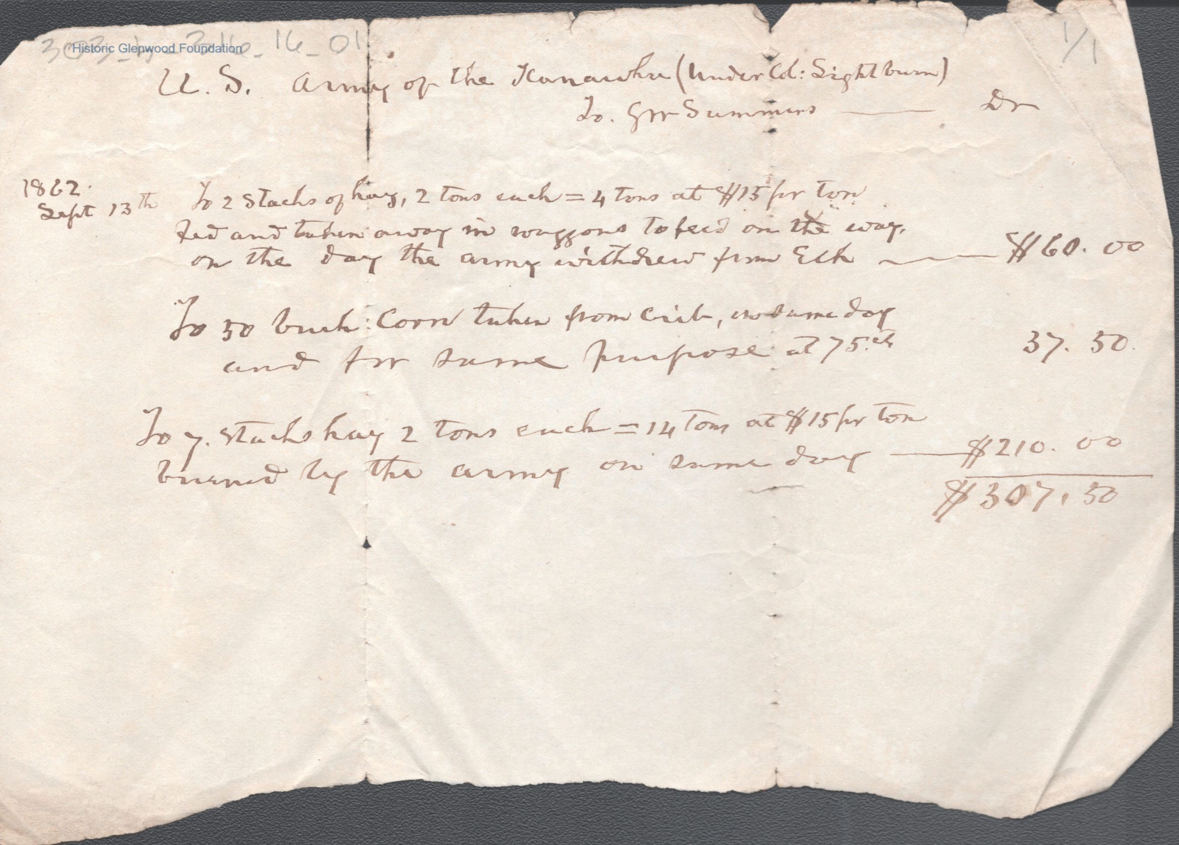 Judge George Summers invoice from U. S. Army for hay and corn, Sep 13, 1862.