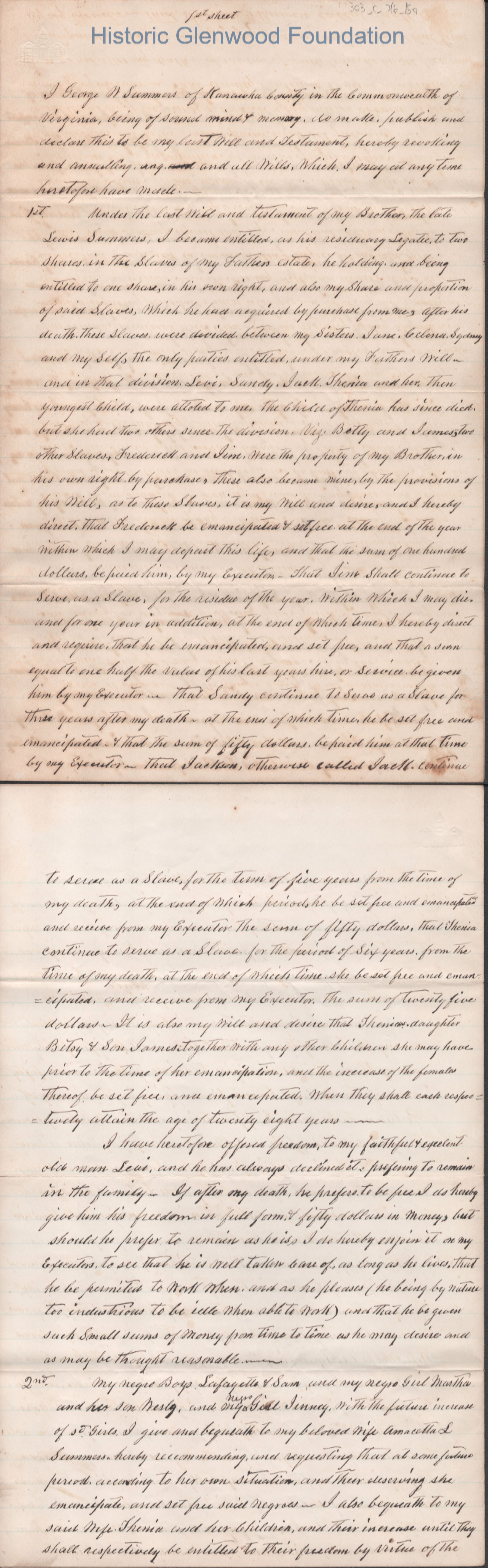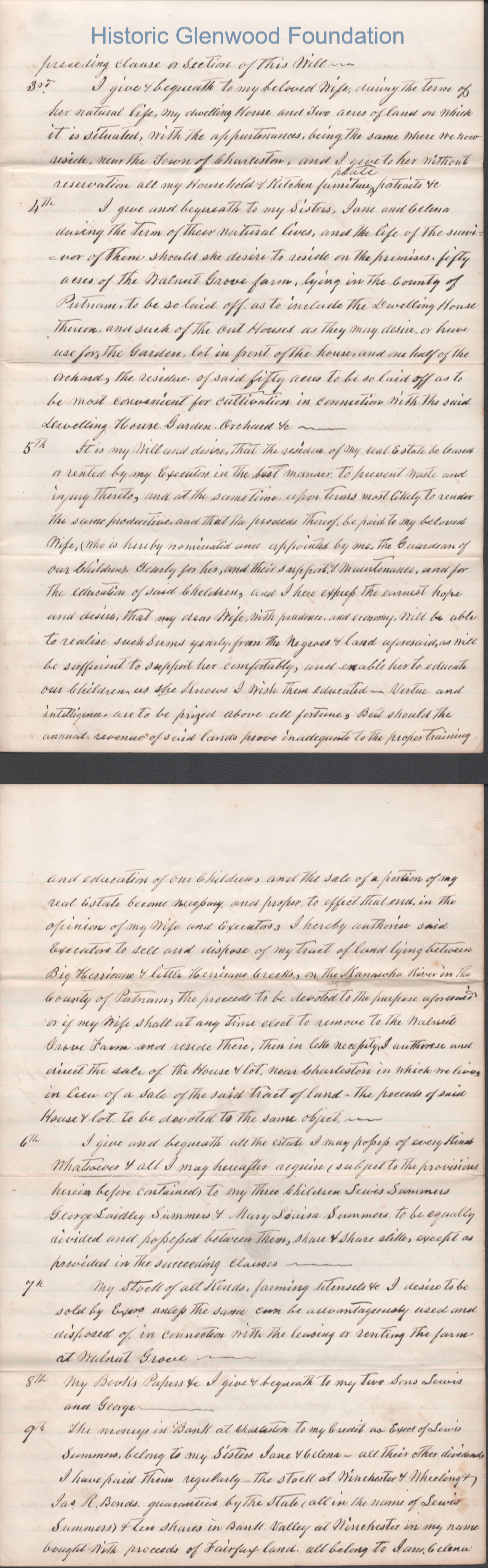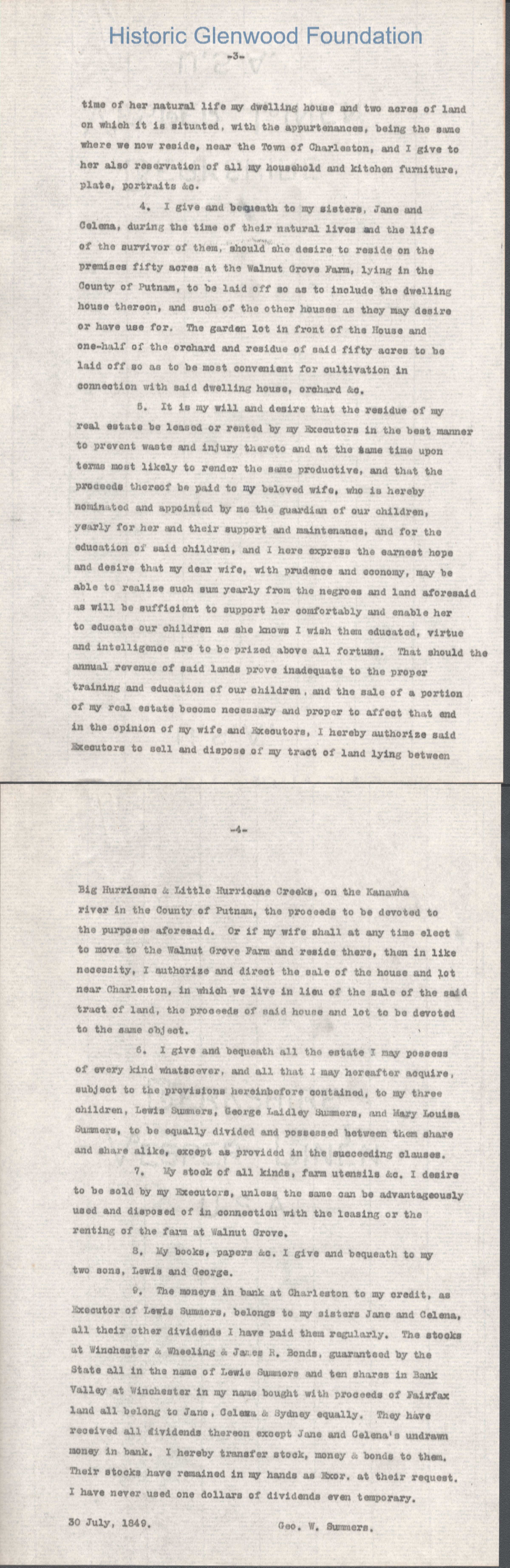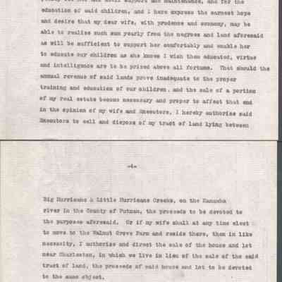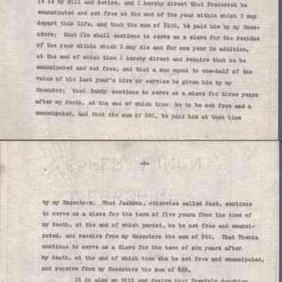 A multi-page legal document, including an original manuscript and a later typewritten transcript, detailing the estate of George W. Summers of Kanawha County. The will outlines the conditional manumission of several enslaved individuals, including Frederick, Jim, Sandy, and Jackson. Following specified periods of service. It further provides for the distribution of real estate, including the "Walnut Grove" farm in Putnam County and a dwelling house near Charleston, among his wife, Amacetta, his sisters, and his three children.Date(s) of Creation
