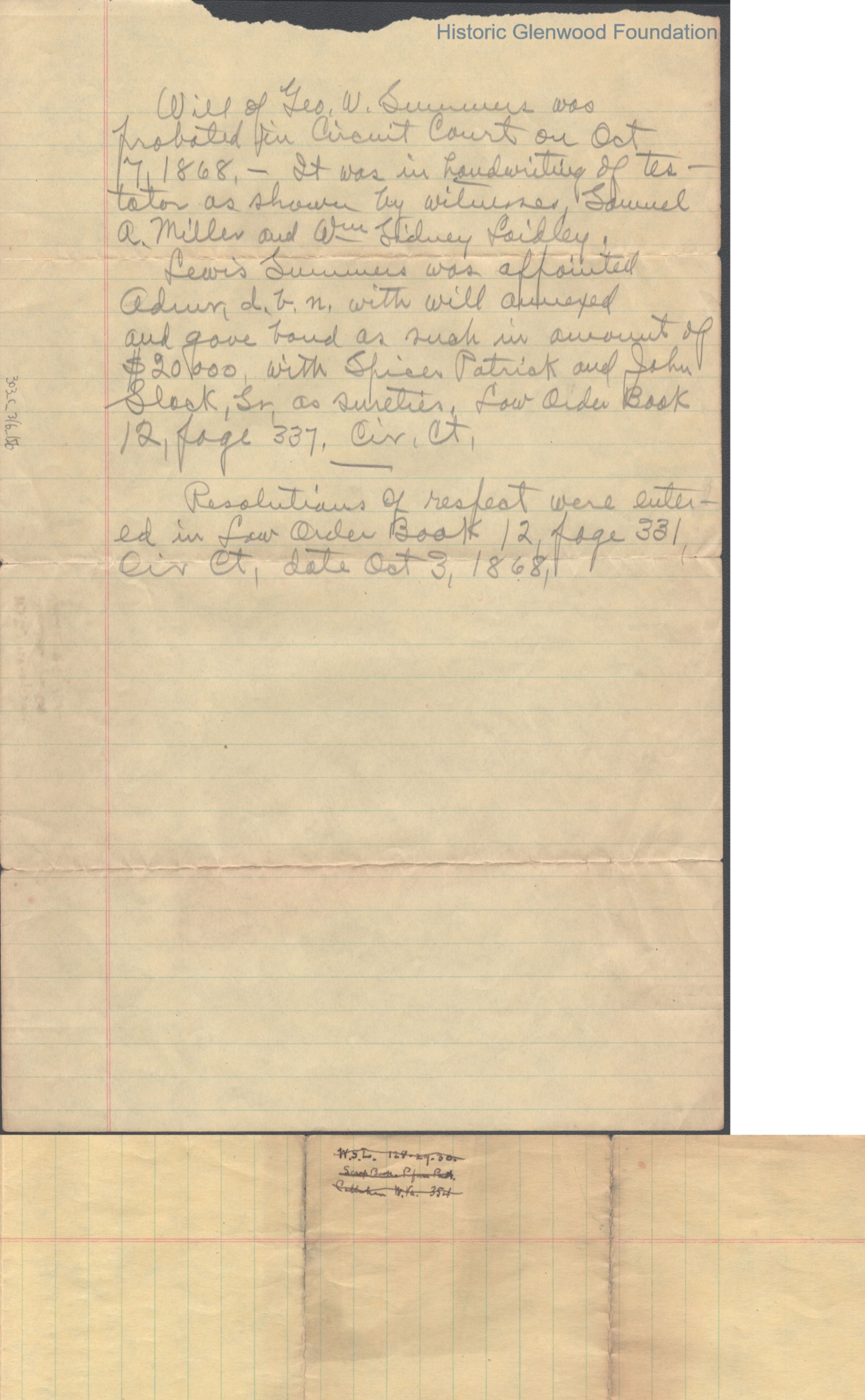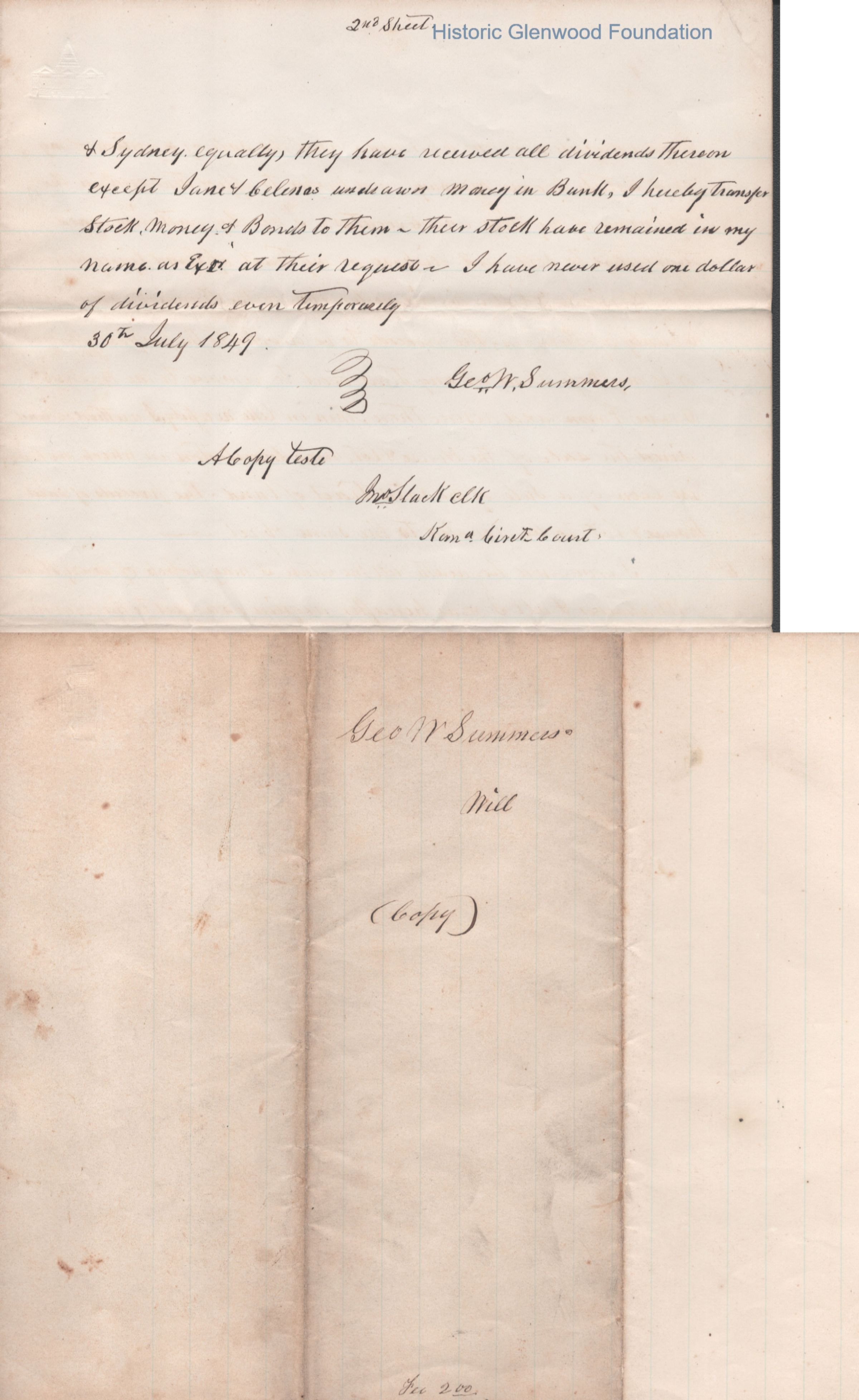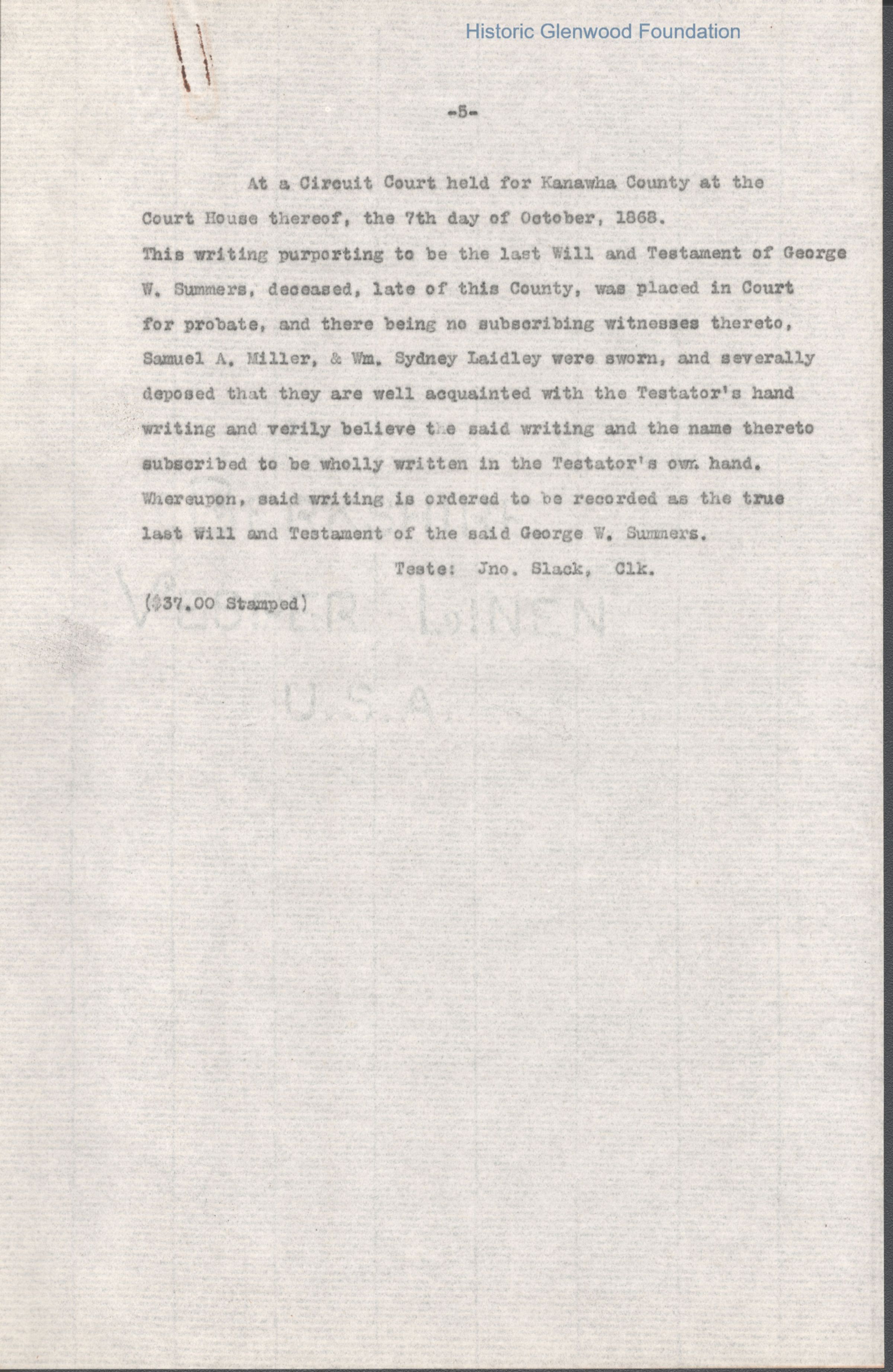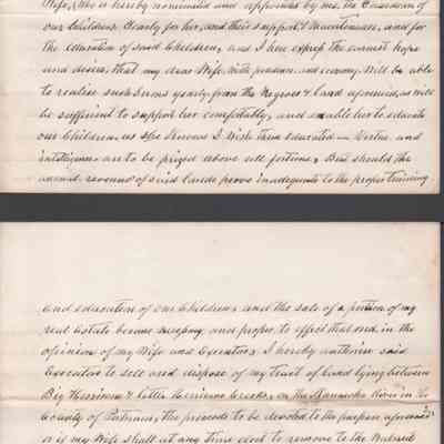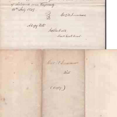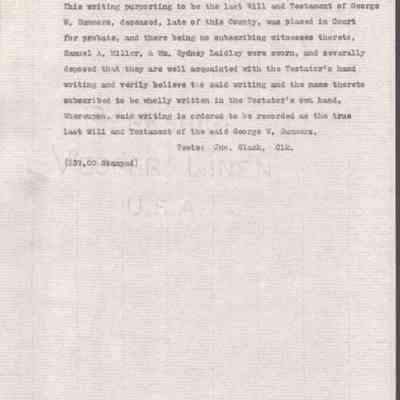 A multi-page legal document, including an original manuscript and a later typewritten transcript, detailing the estate of George W. Summers of Kanawha County. The will outlines the conditional manumission of several enslaved individuals, including Frederick, Jim, Sandy, and Jackson. Following specified periods of service. It further provides for the distribution of real estate, including the "Walnut Grove" farm in Putnam County and a dwelling house near Charleston, among his wife, Amacetta, his sisters, and his three children.Date(s) of Creation