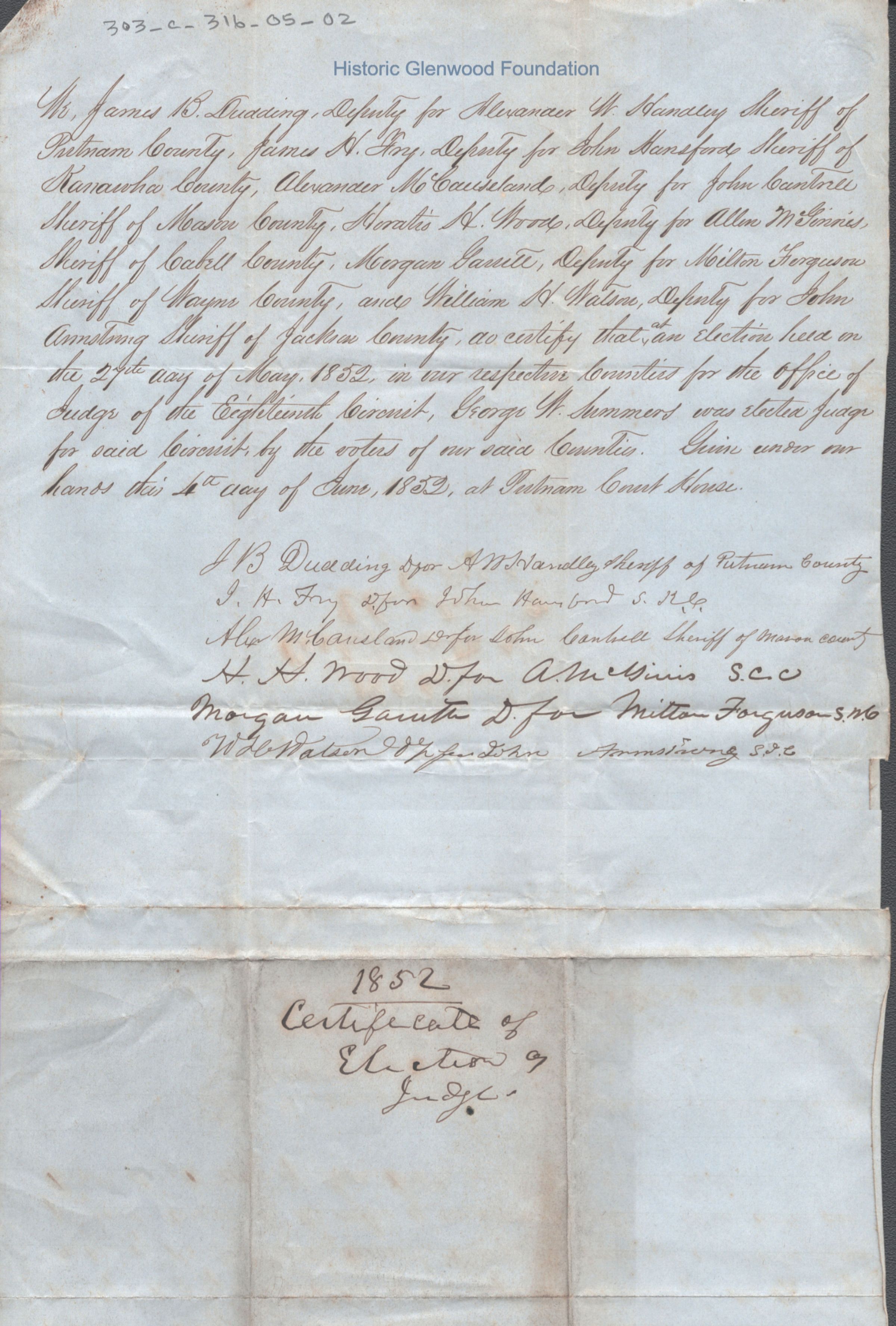Handwritten certification signed by the deputy sheriffs of Putnam, Kanawha, Mason, Cabell, Wayne, and Jackson Counties. The document certifies that in the election held on May 27, 1852, George W. Summers was elected Judge for the Eighteenth Circuit. This certificate was finalized at the Putnam Court House on June 4, 1852.Date(s) of Creation