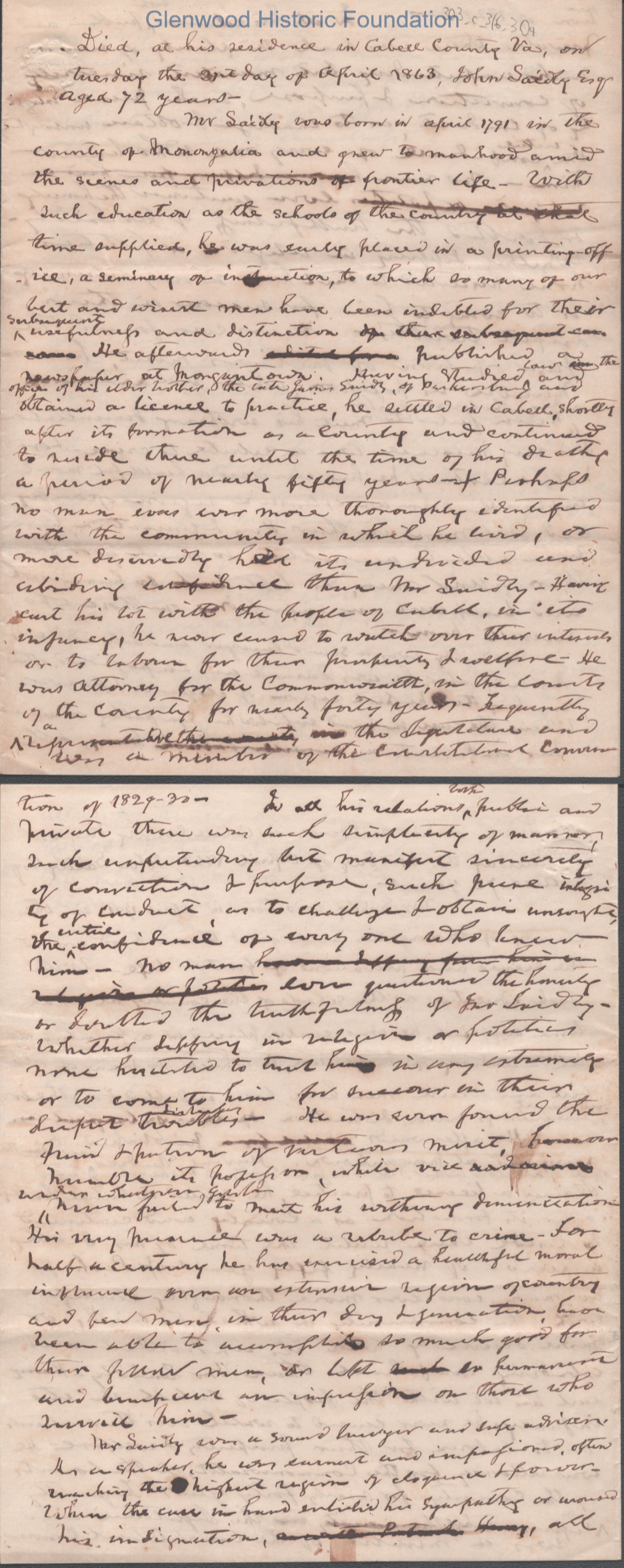 A multi-page handwritten manuscript eulogizing John Laidley, a prominent early lawyer and public official in Cabell County, Virginia. The text chronicles his professional achievements, his character, and his staunch Unionist perspective during the Civil War.