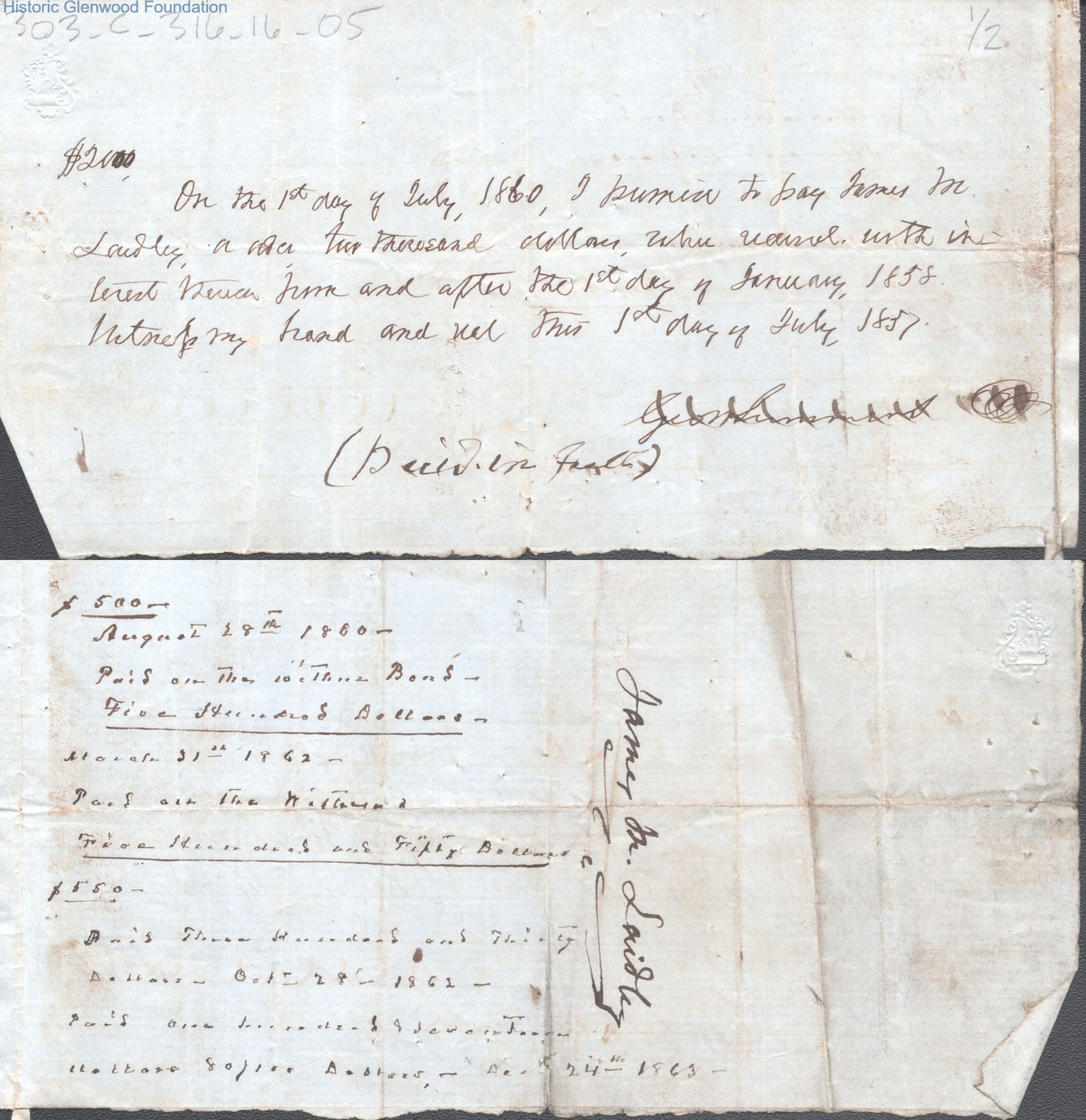Judge George Summers Promissory Note for Payments to James M. Laidley, Jul 1, 1857