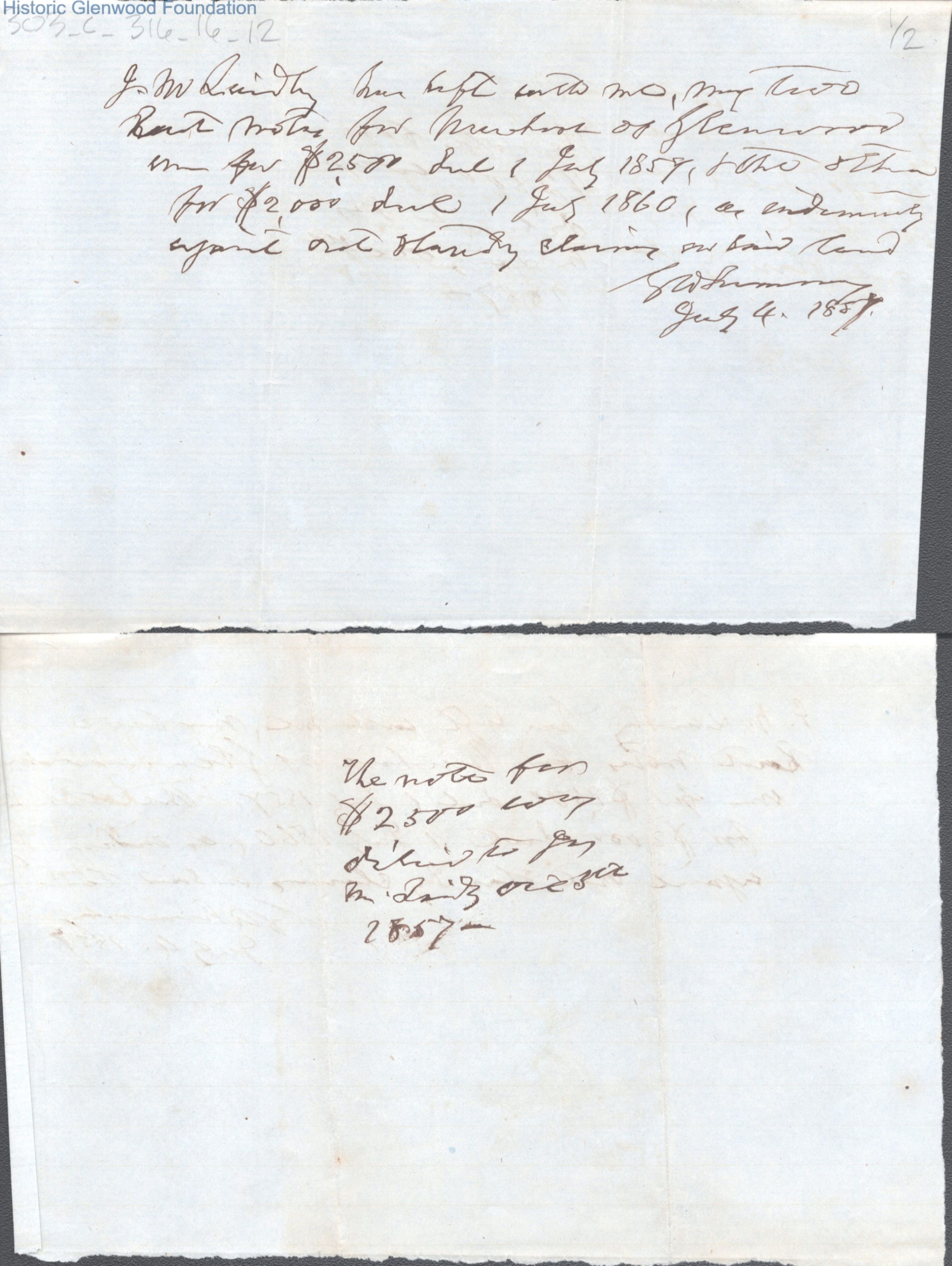 Judge George Summers receipt to James M. Laidley for return of notes, dated Jul 4, 1857.