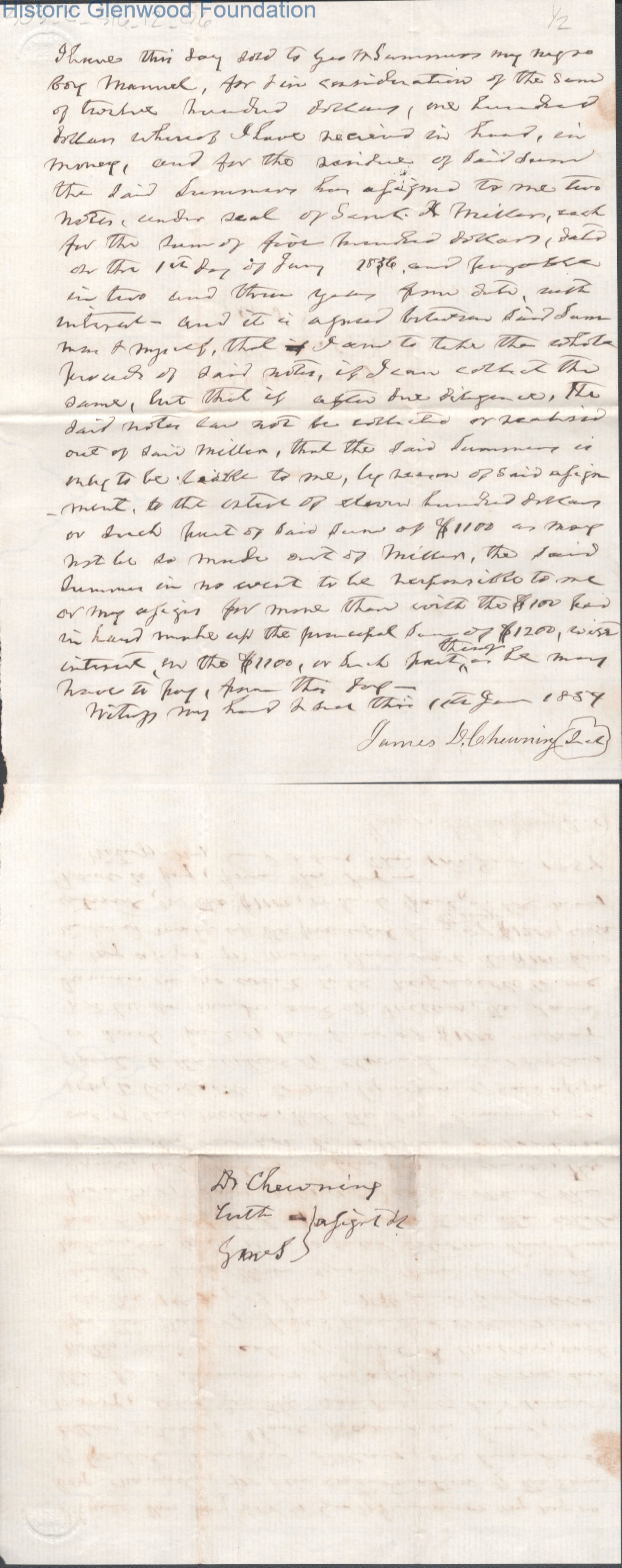 Judge George Summers slave purchase document from James D. Chewning, dated Jan 11, 1854.
