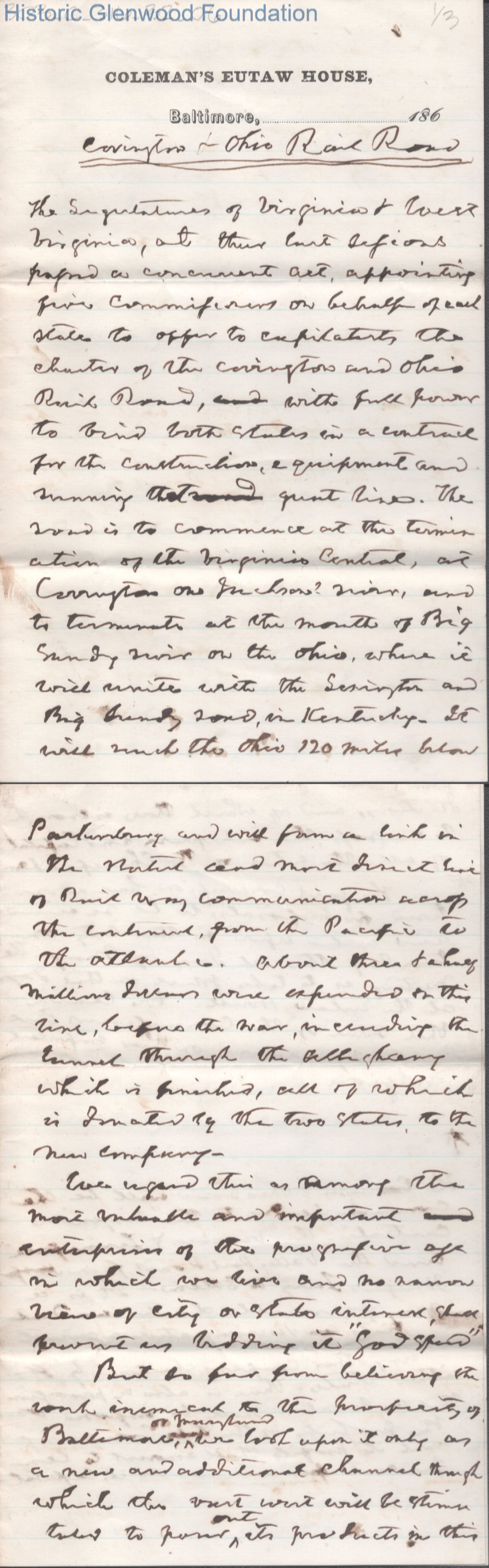Three pages of text from Judge George Summers speech about the Covington & Ohio Railroad, no date.