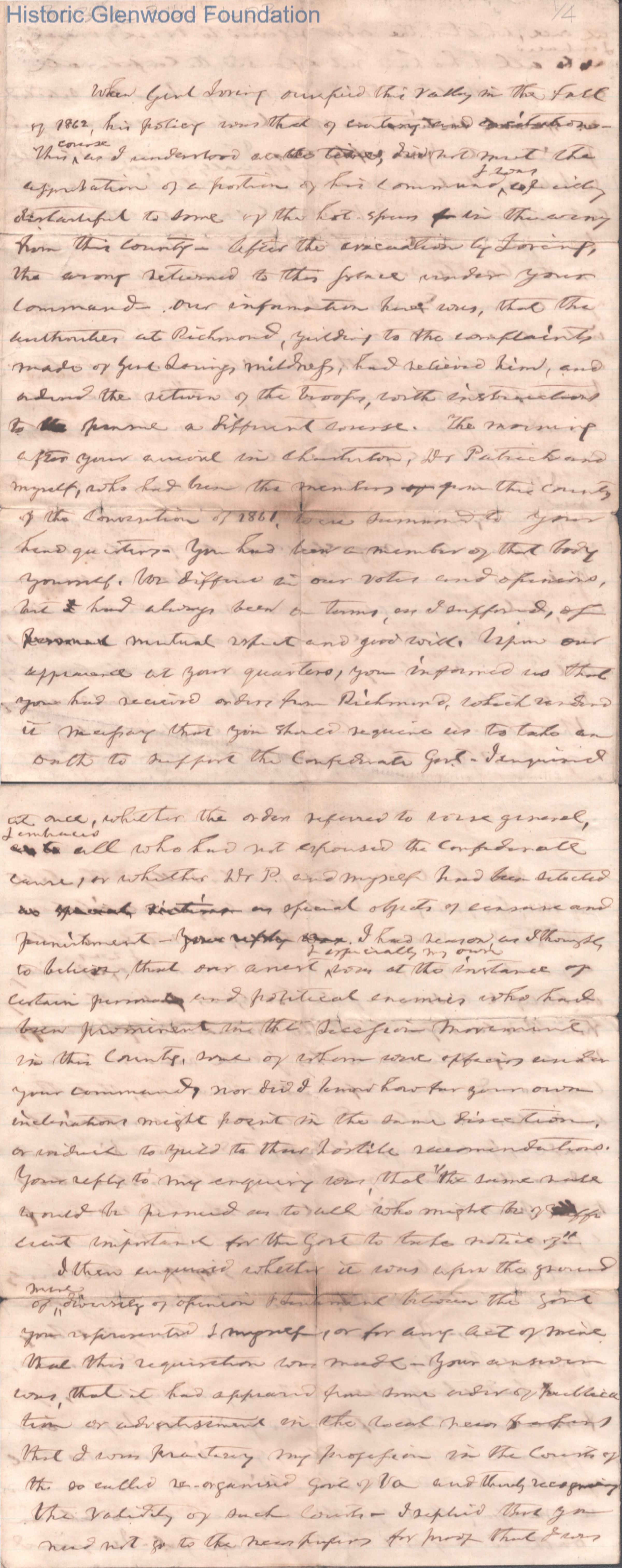 Four-page letter from Judge George Summers to Gen. John Echols, c. 1865. Echols had been a Confederate officer during the Civil War.