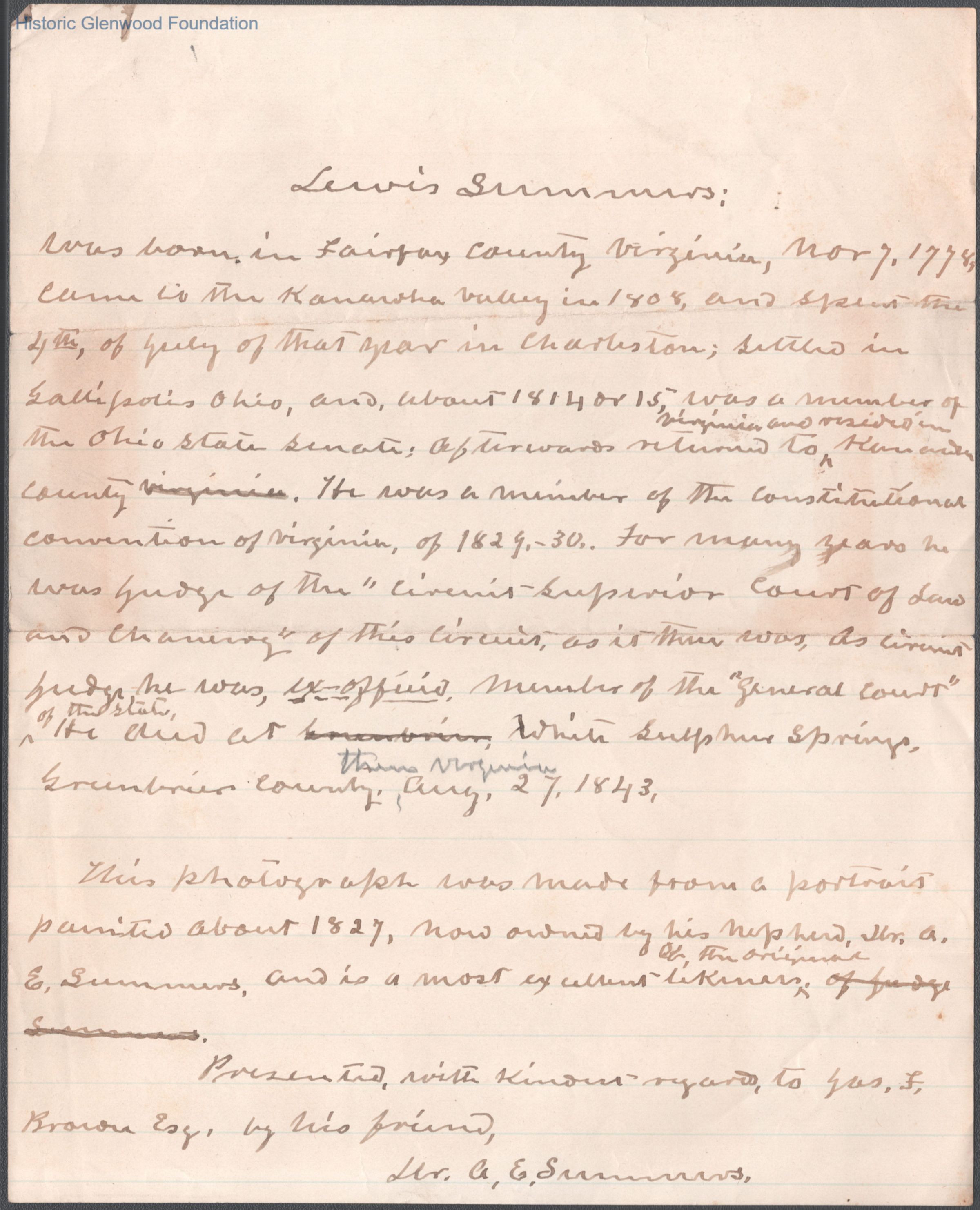 Brief biography of Judge Lewis Summers written by his nephew Dr. Albert Edgar Summers, refers to a photograph of a painting of Judge Summers which was painted about 1827.