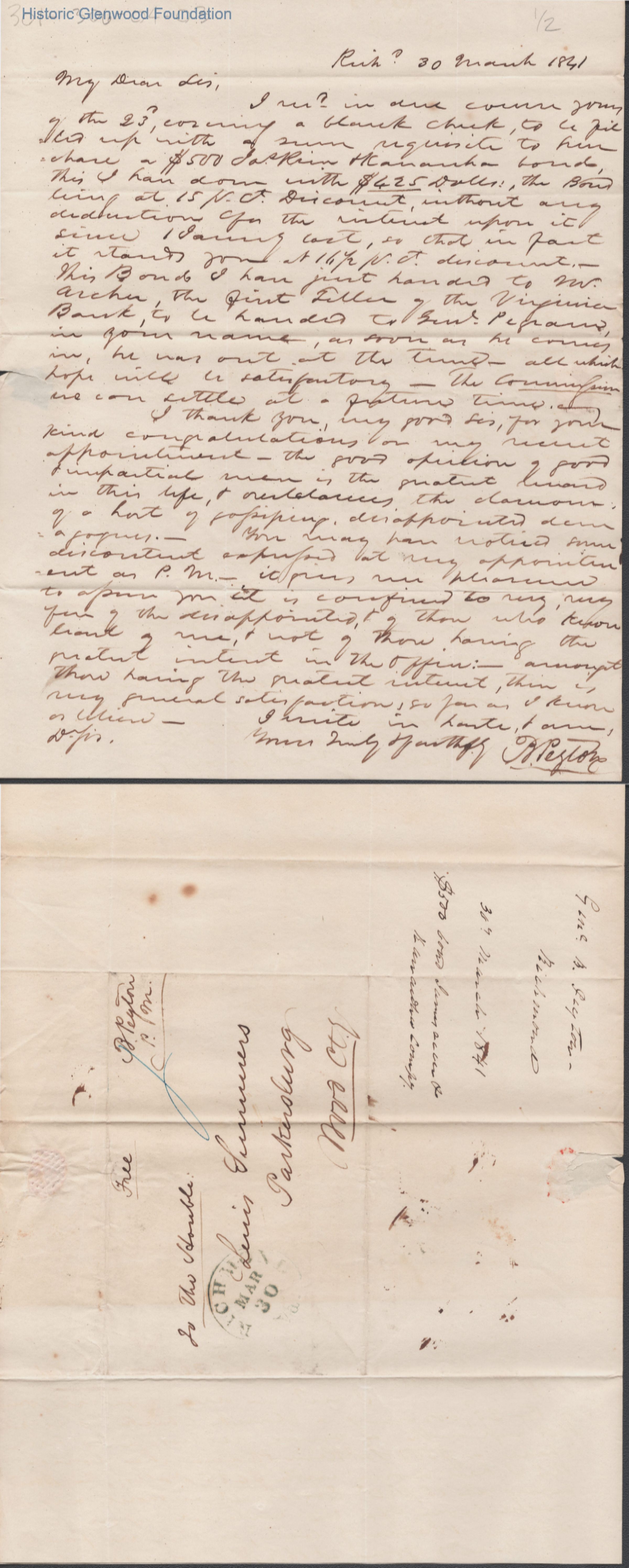 Judge Lewis Summers from B. Peyton, Mar 30, 1841