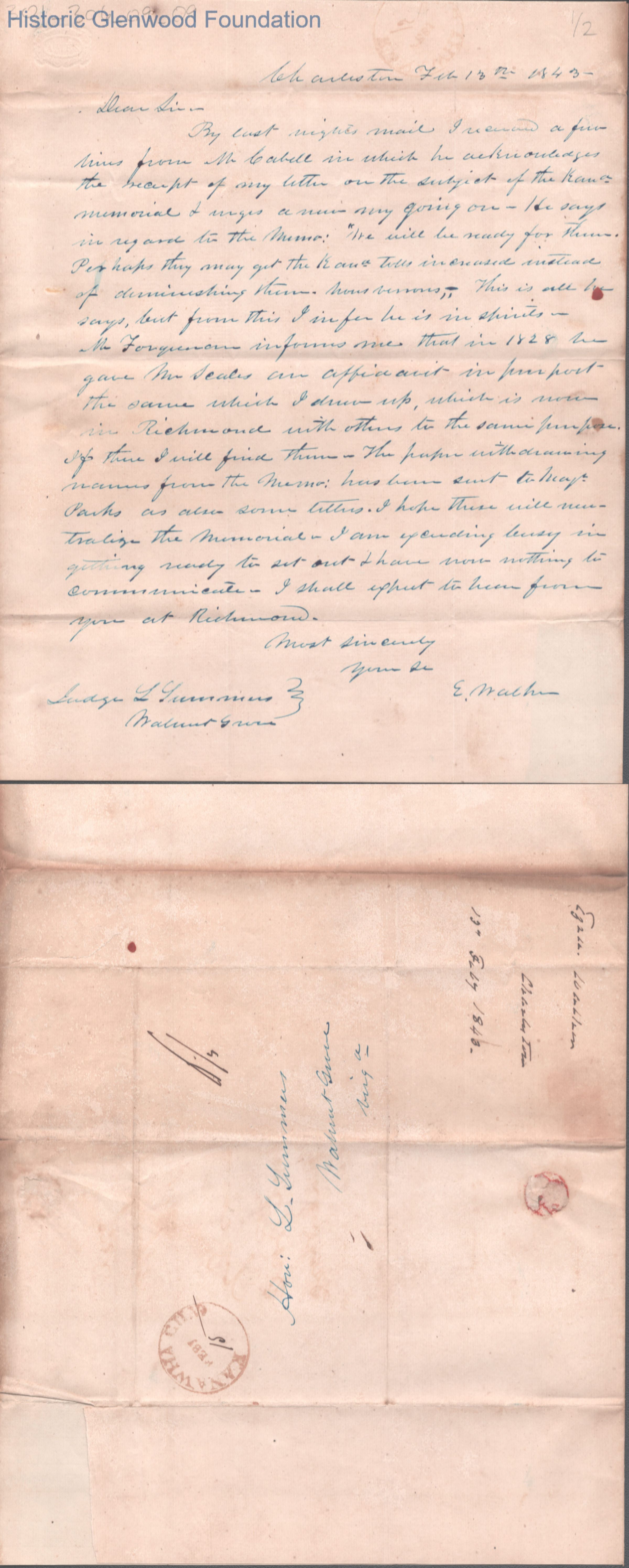 Single page letter to Judge Lewis Summers from Ezra Walker, Feb 13, 1843.