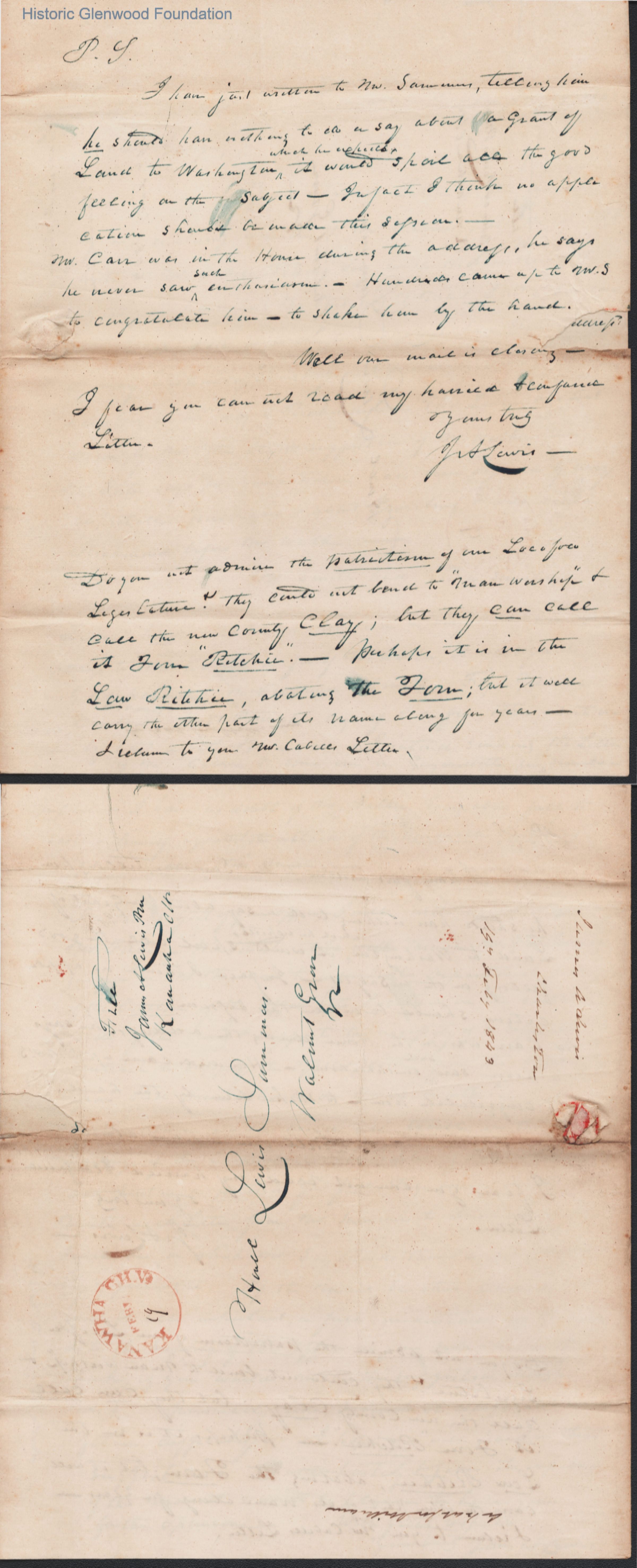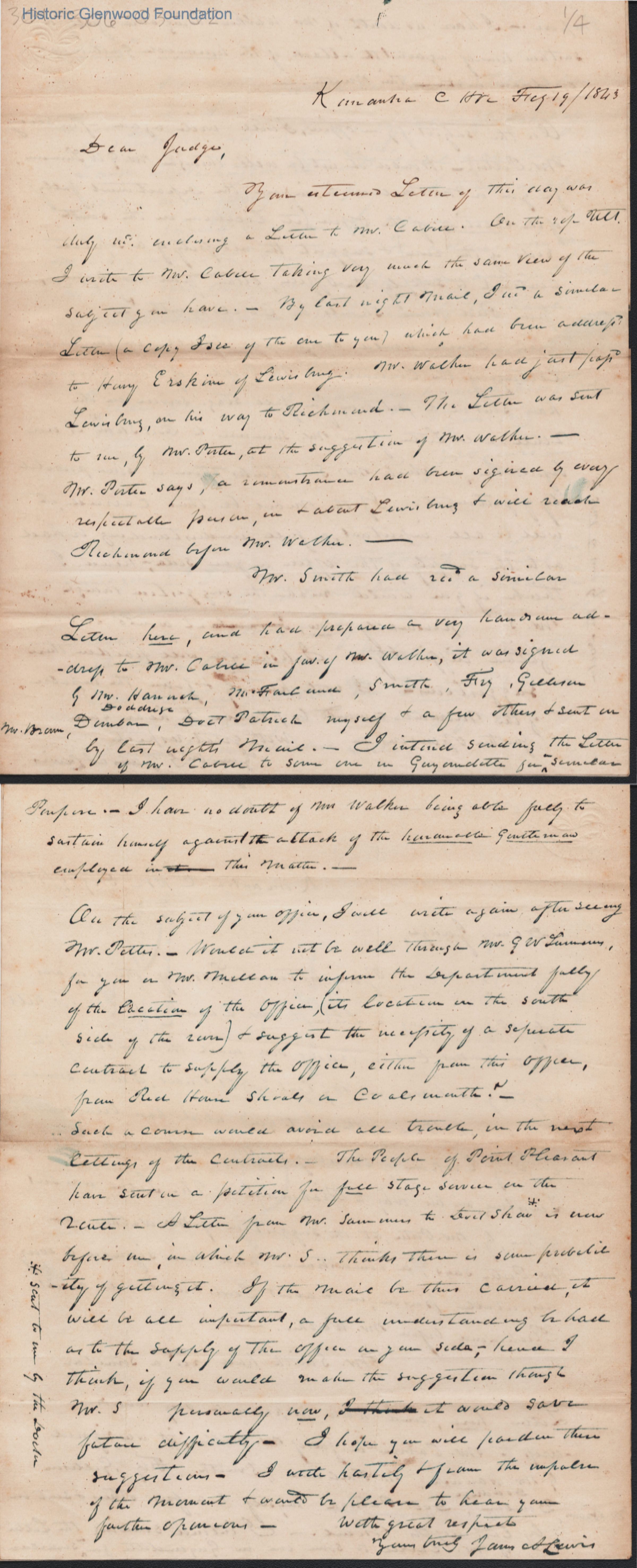 Judge Lewis Summers from James Lewis, Feb 19, 1843