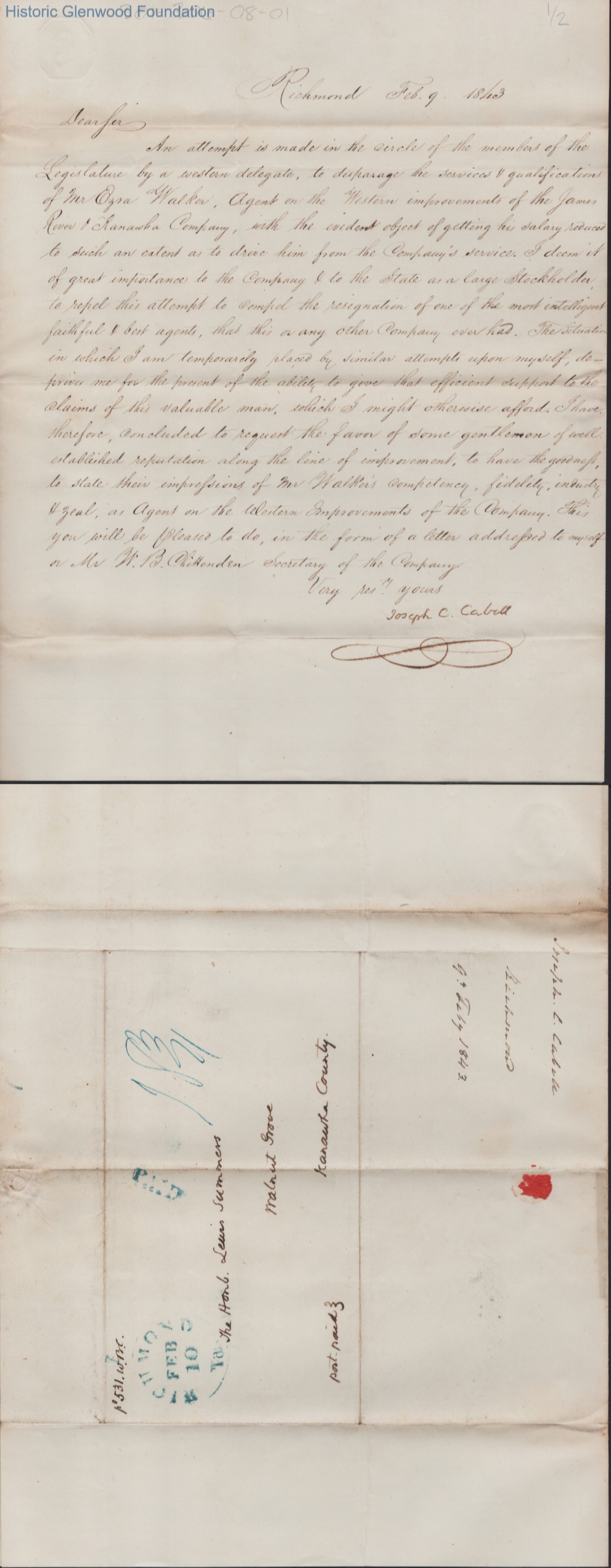 Single page letter to Judge Lewis Summers from Joseph C. Cabell, Feb 9, 1843.