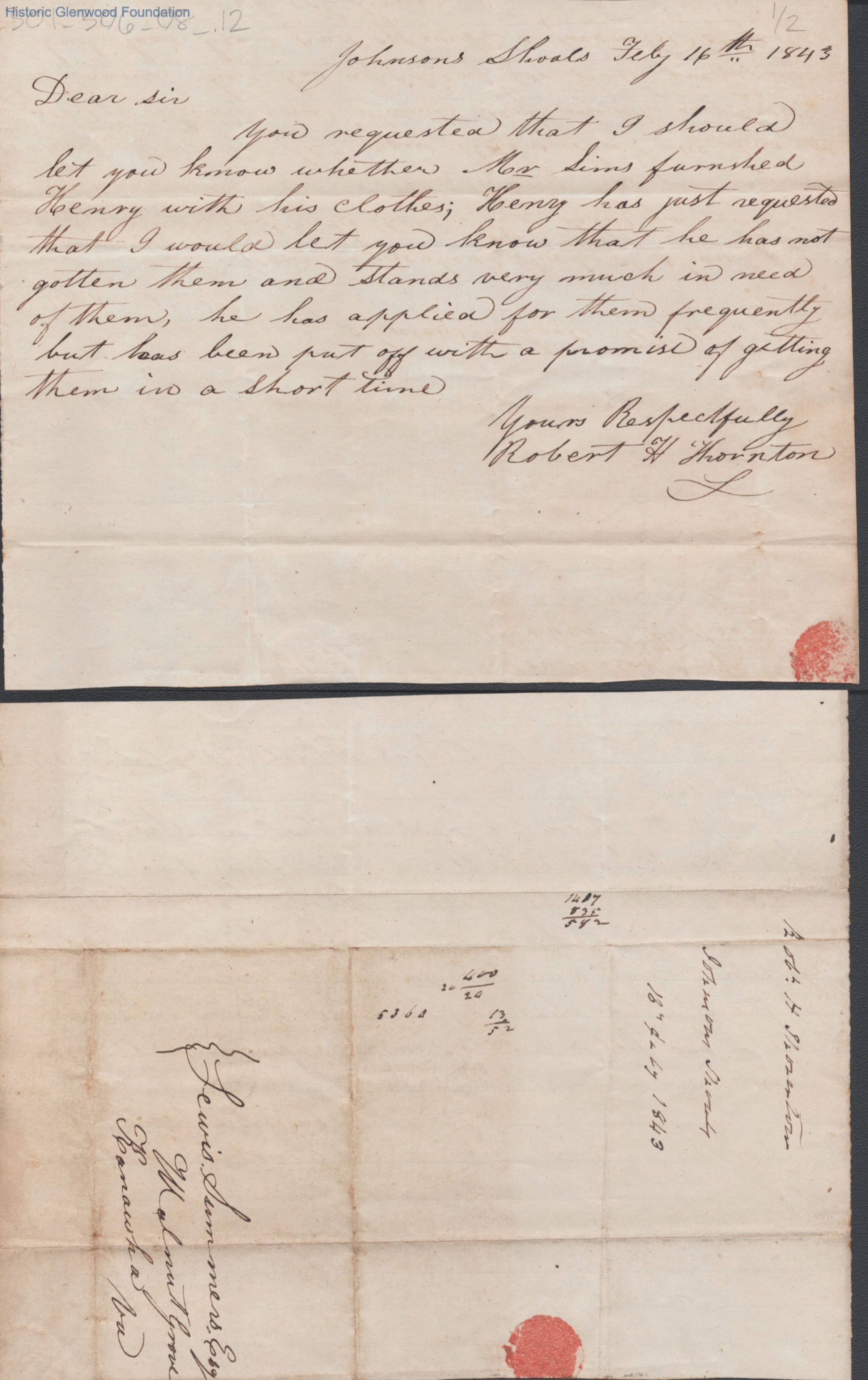 Single page letter to Judge Lewis Summers from Robert H. Thornton, Feb 16, 1843.