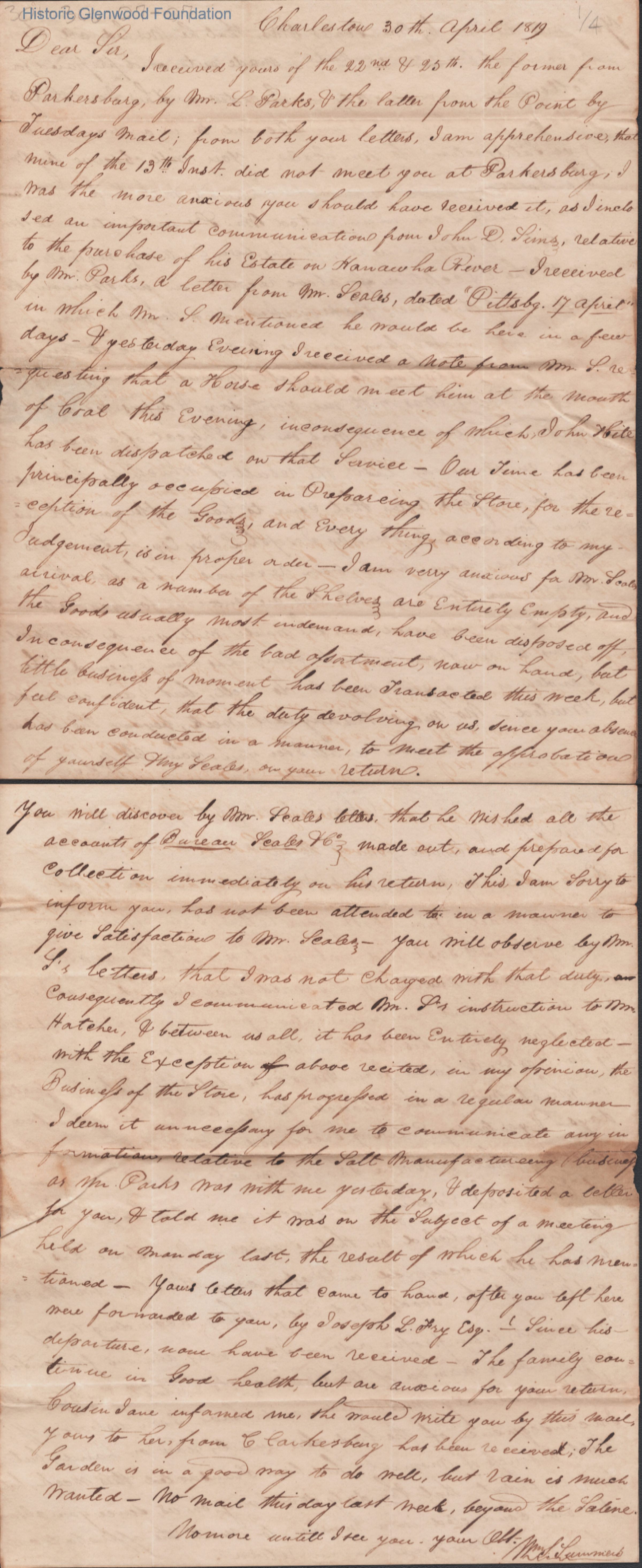 Three-page letter to Judge Lewis Summers from William S. Summers, Apr 30, 1819.