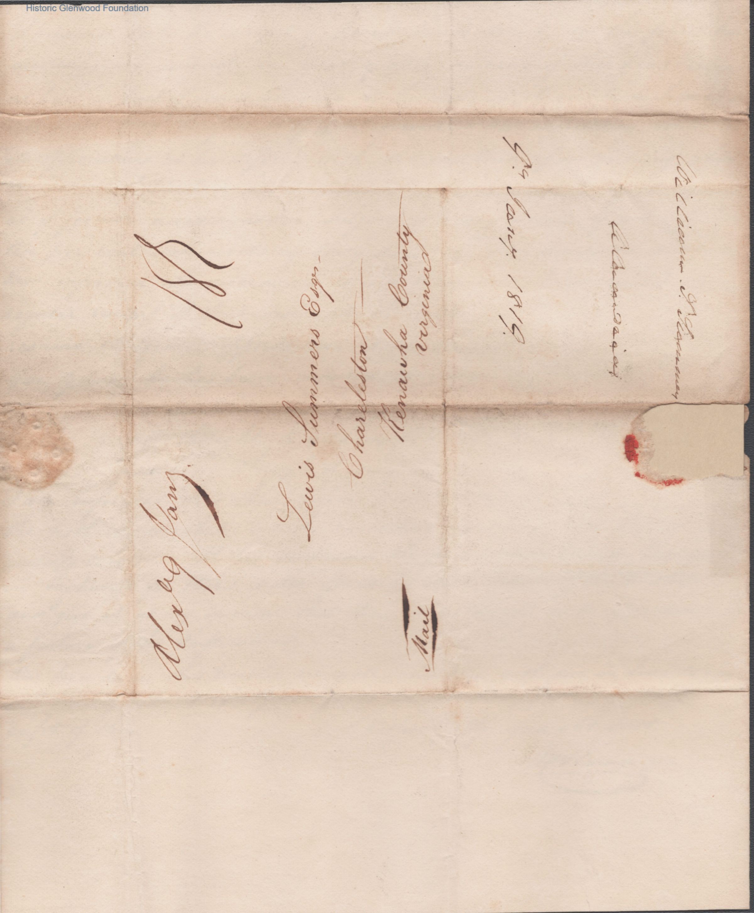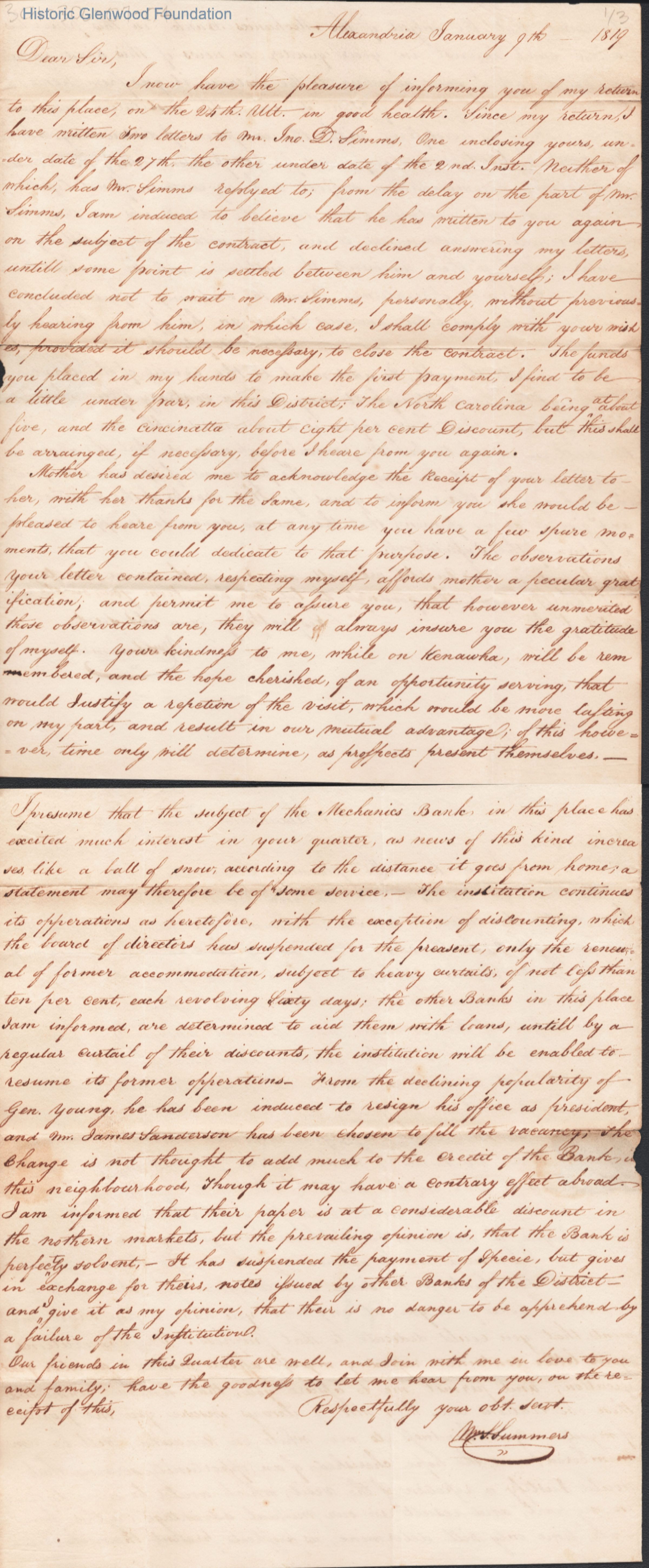 Two-page letter to Judge Lewis Summers from William S. Summers, Jan 9, 1819.