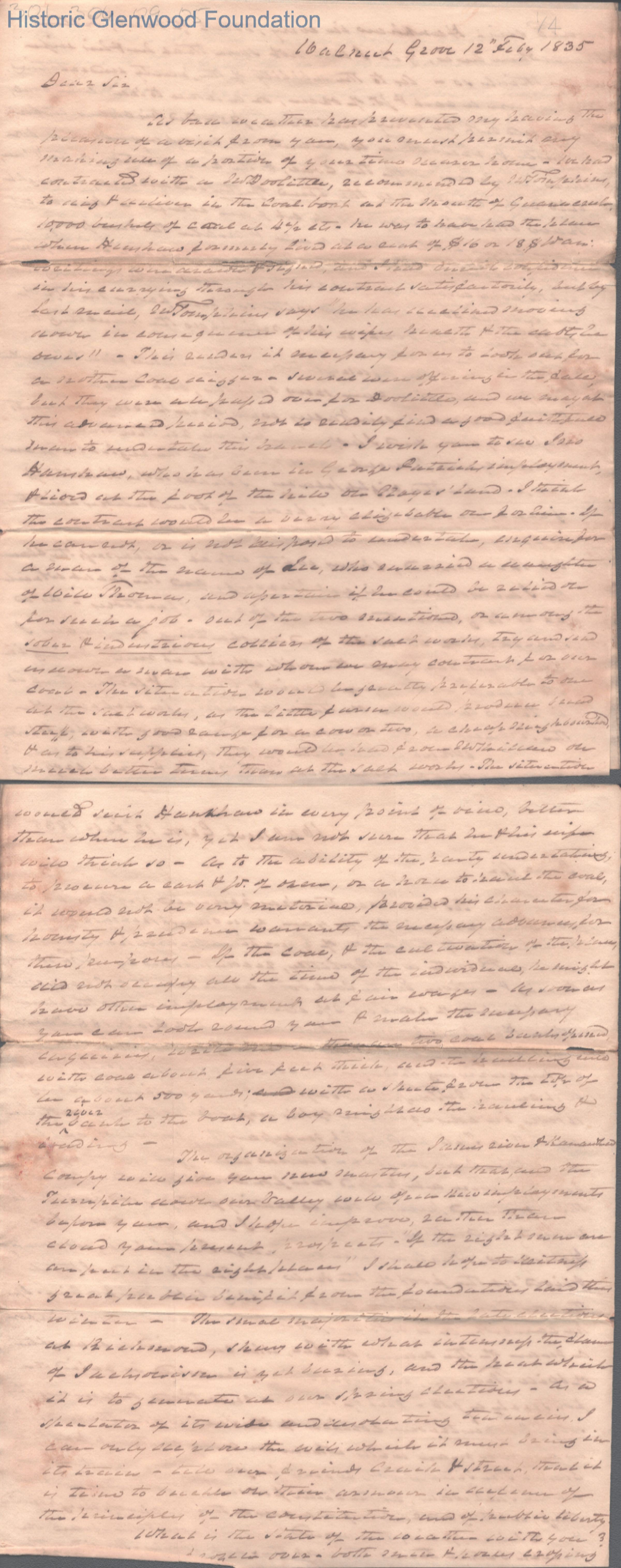 Three-page letter from Judge Lewis Summers to Ezra Walker, Feb 12, 1835.