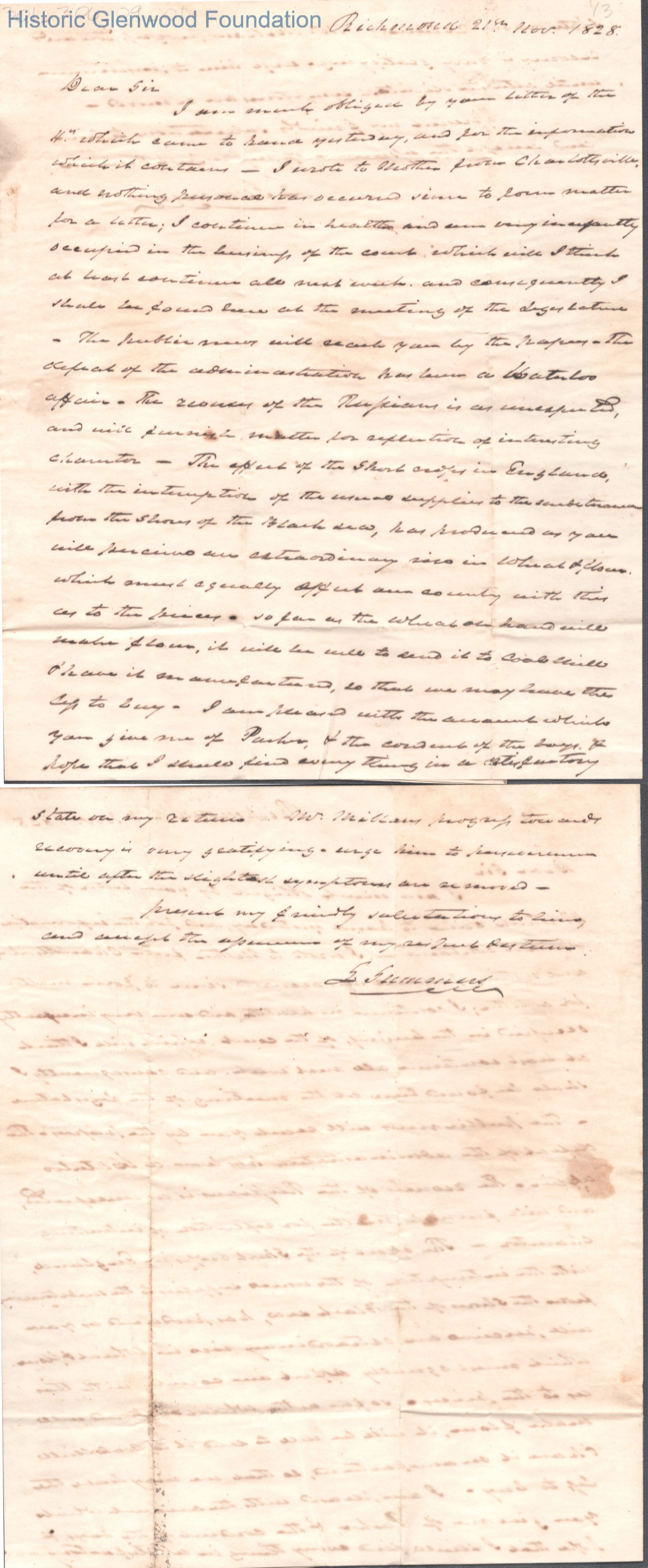 Two-page letter from Judge Lewis Summers to Ezra Walker, Nov 21, 1828.
