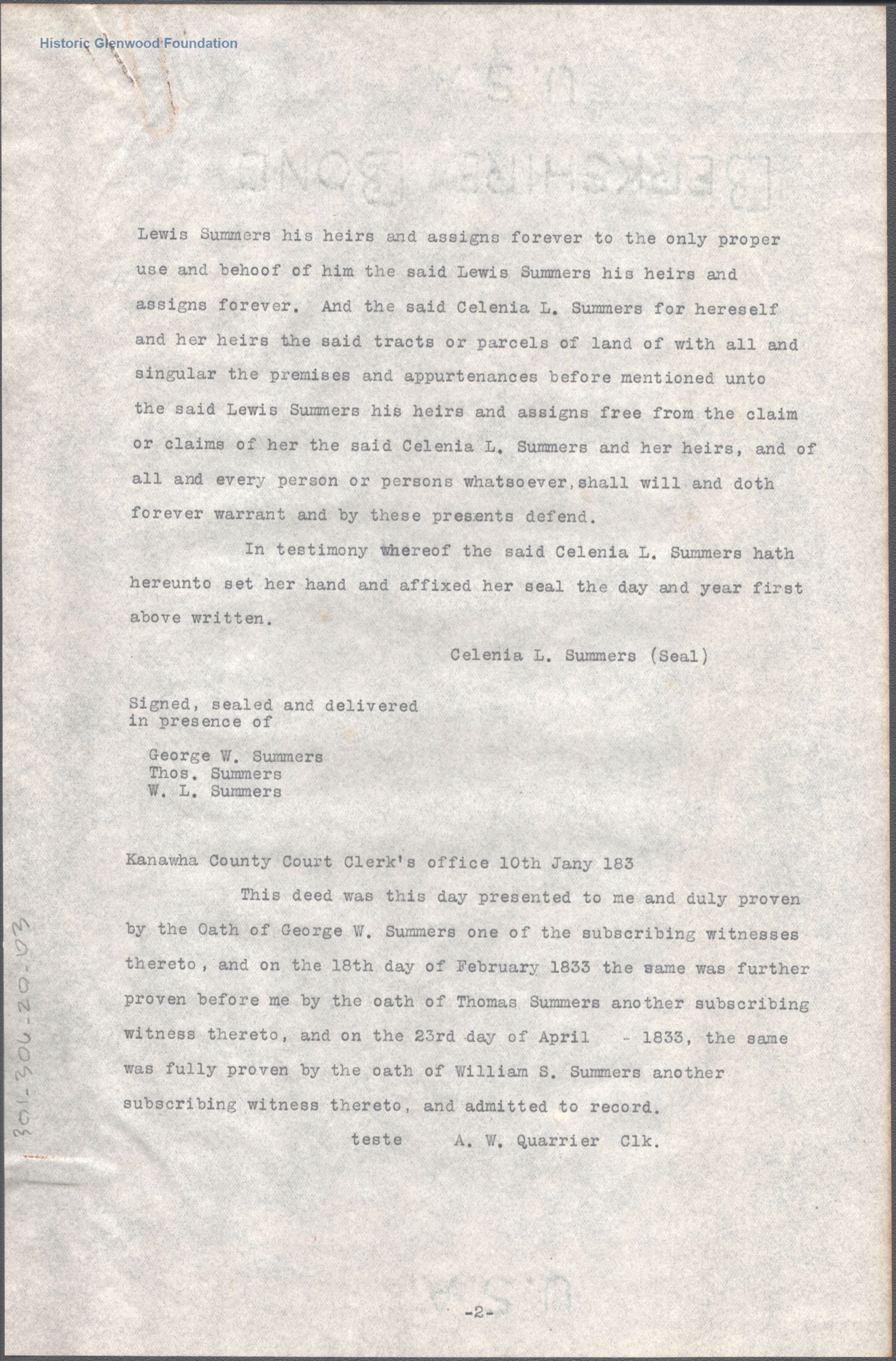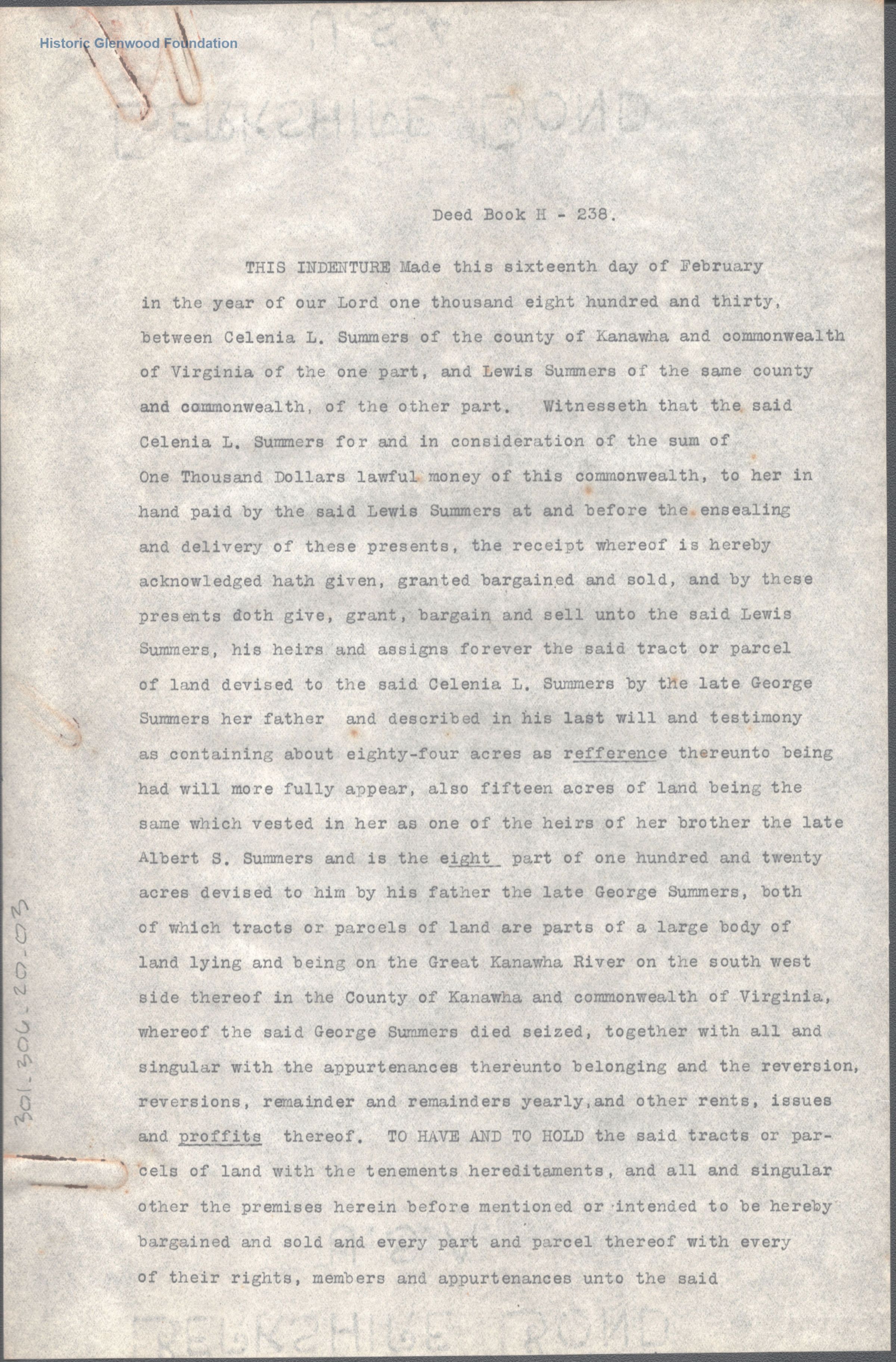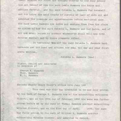 Judge Lewis Summers, transcript of property transfer from Celenia L. Summers; February 16, 1830