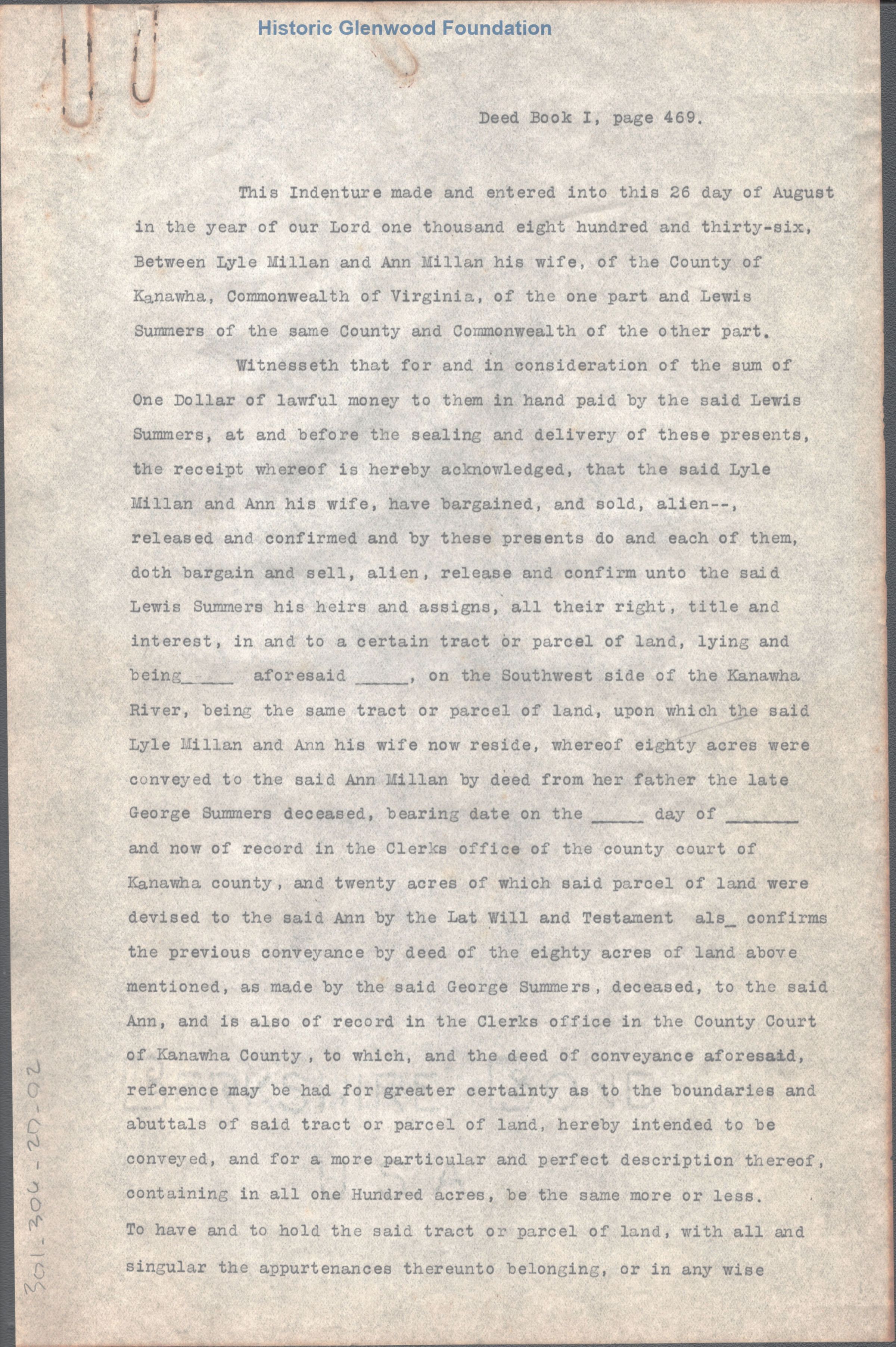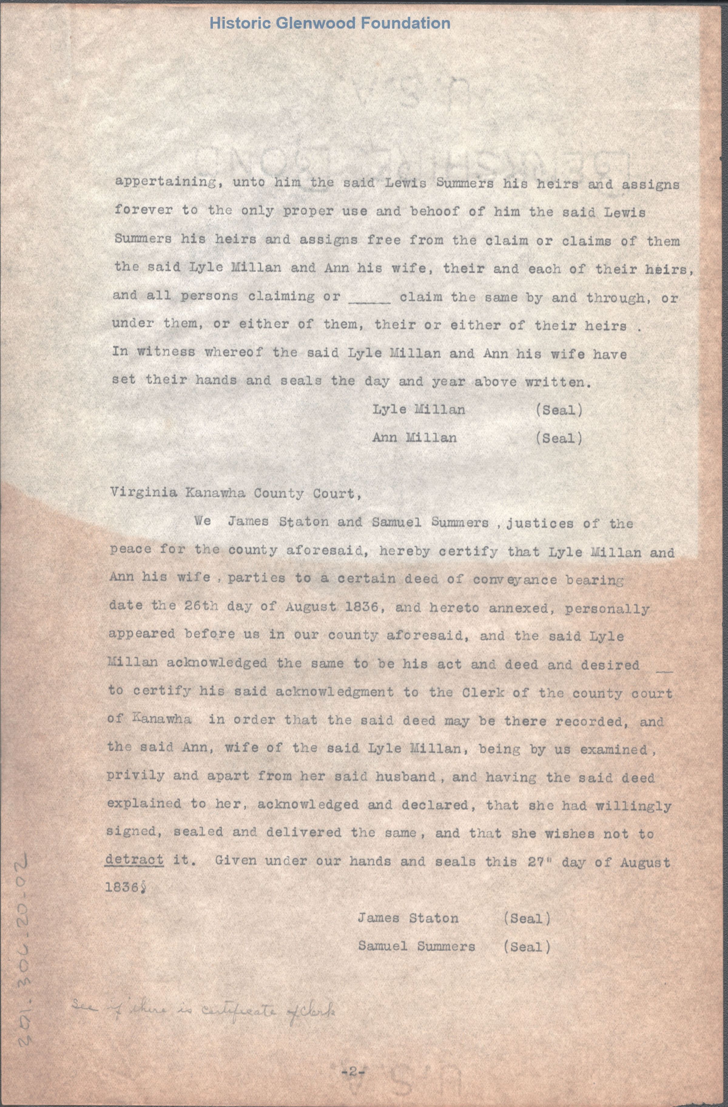 Judge Lewis Summers, transcript of property transfer from Lyle & Ann Millan, Aug. 27, 1836