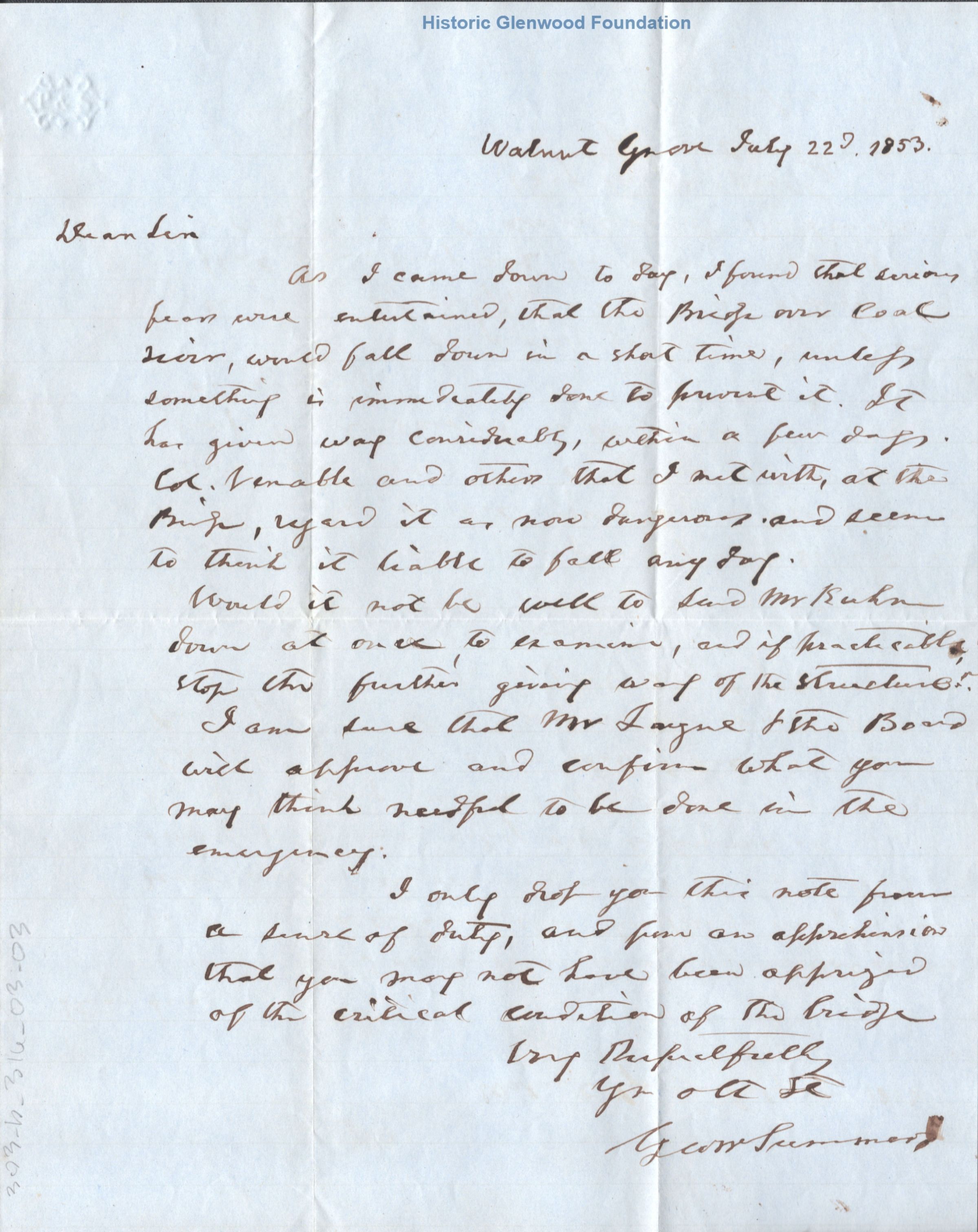 Single page letter from Judge George Summers to unknown recipient regarding condition of bridge over Coal RiverDate(s) of Creation