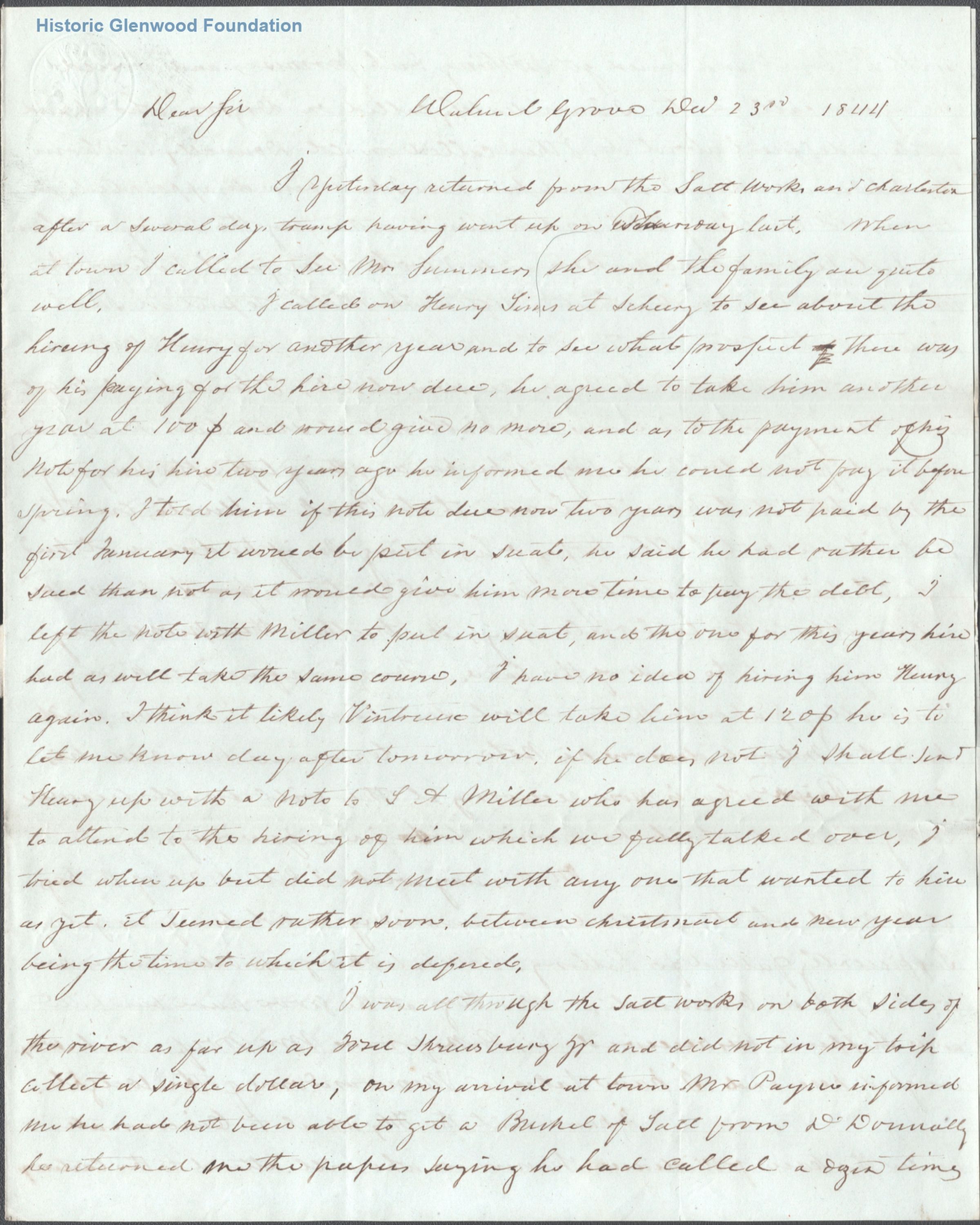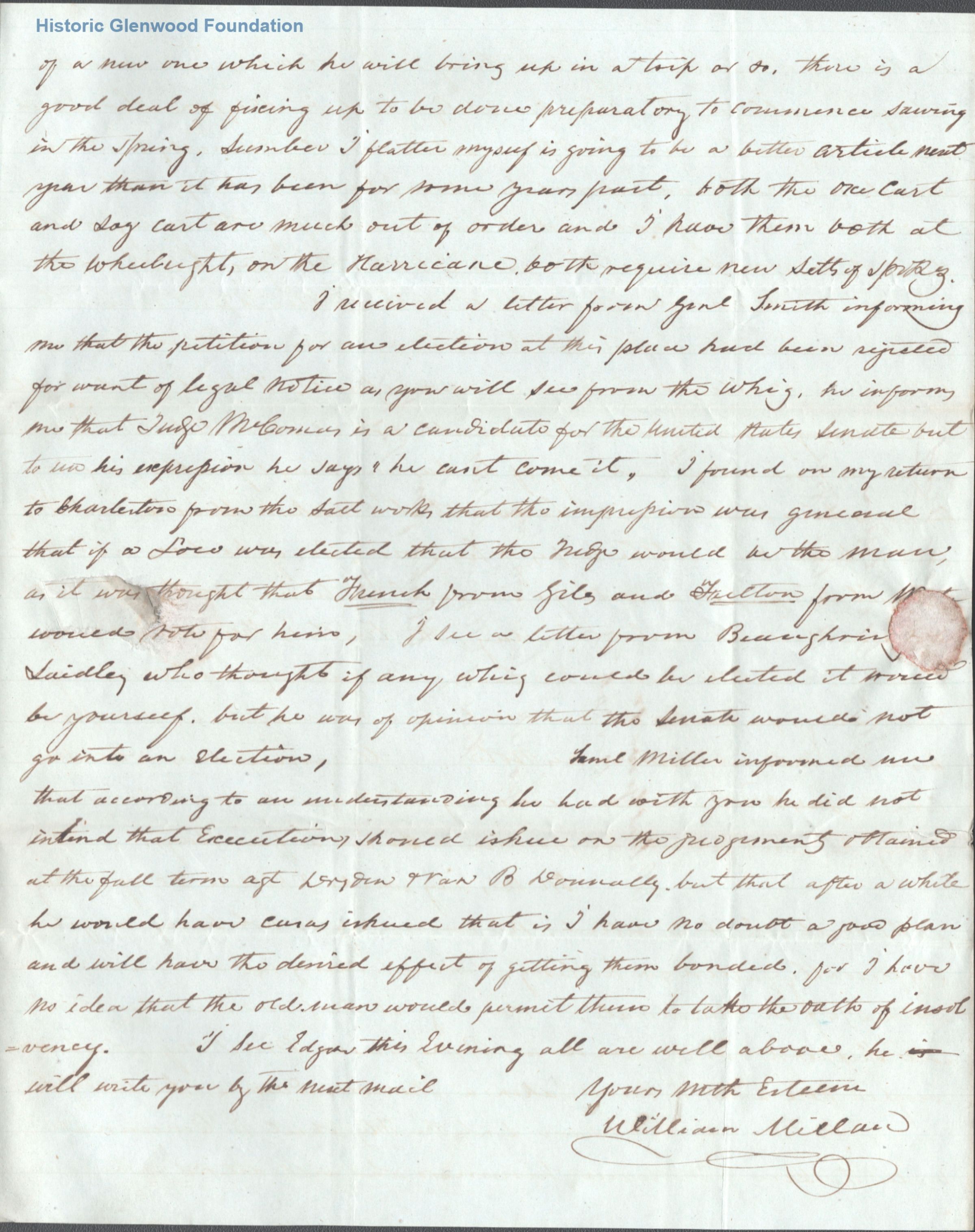 3-page letter to Judge George Summers from William Millan at Walnut GroveDate(s) of Creation