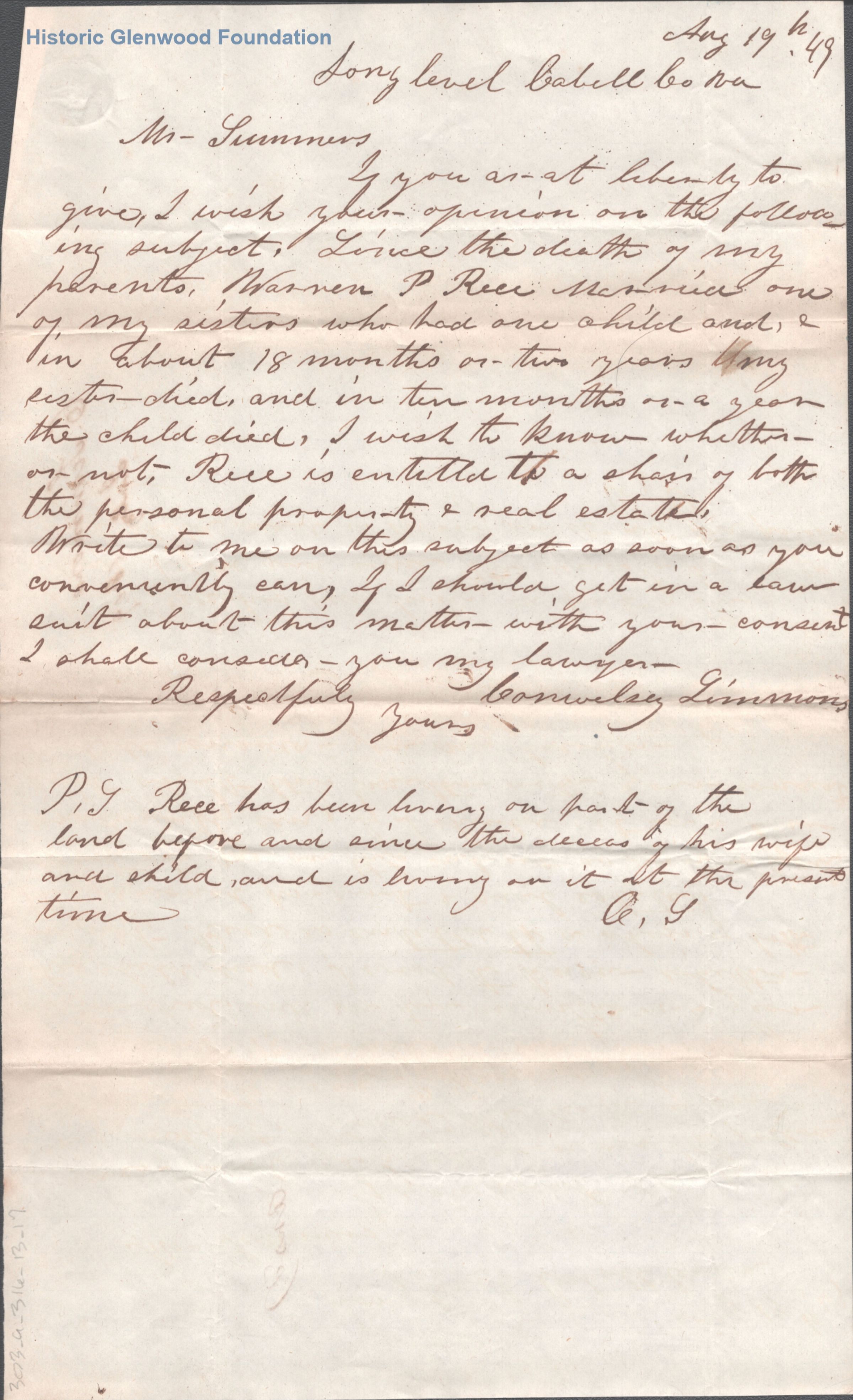 Correspondence from legal client of Summers & Miller: C. Timmons; August 19, 1849