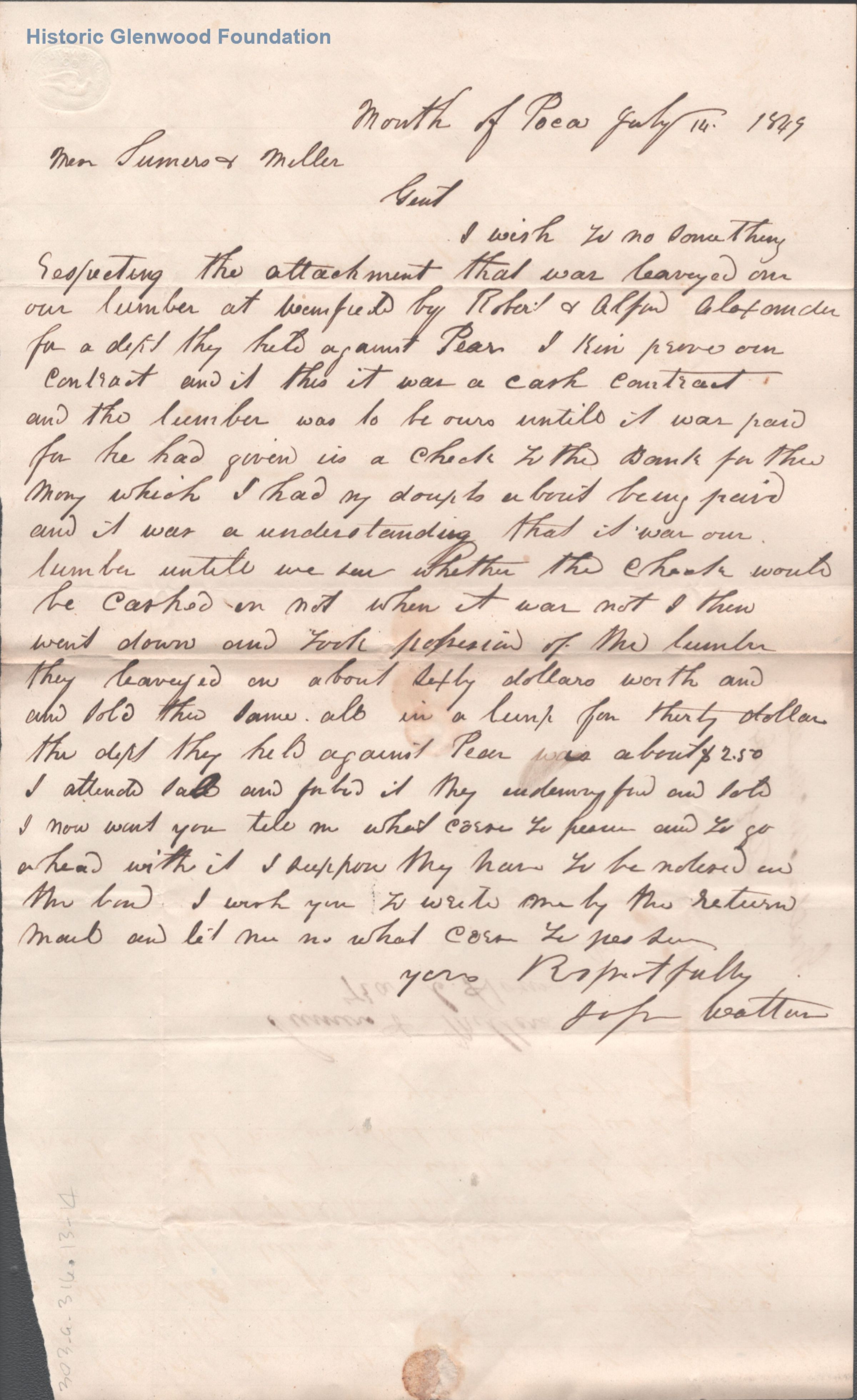 Correspondence from legal client of Summers & Miller: Joseph Walton; July 14, 1849