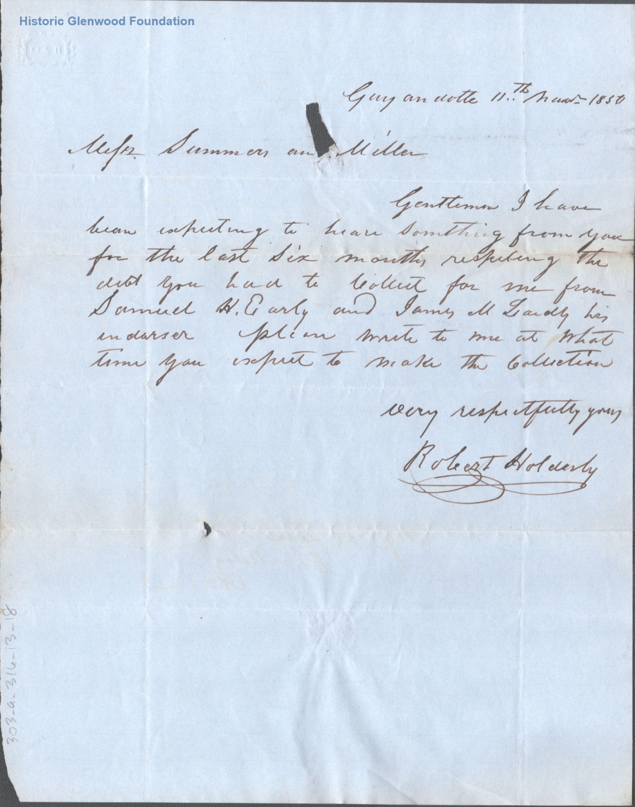 Letter to the law partnership of Summers & Miller from Robert Holderby inquiring about debt collected from Samuel Early endorsed by James M. Laidley