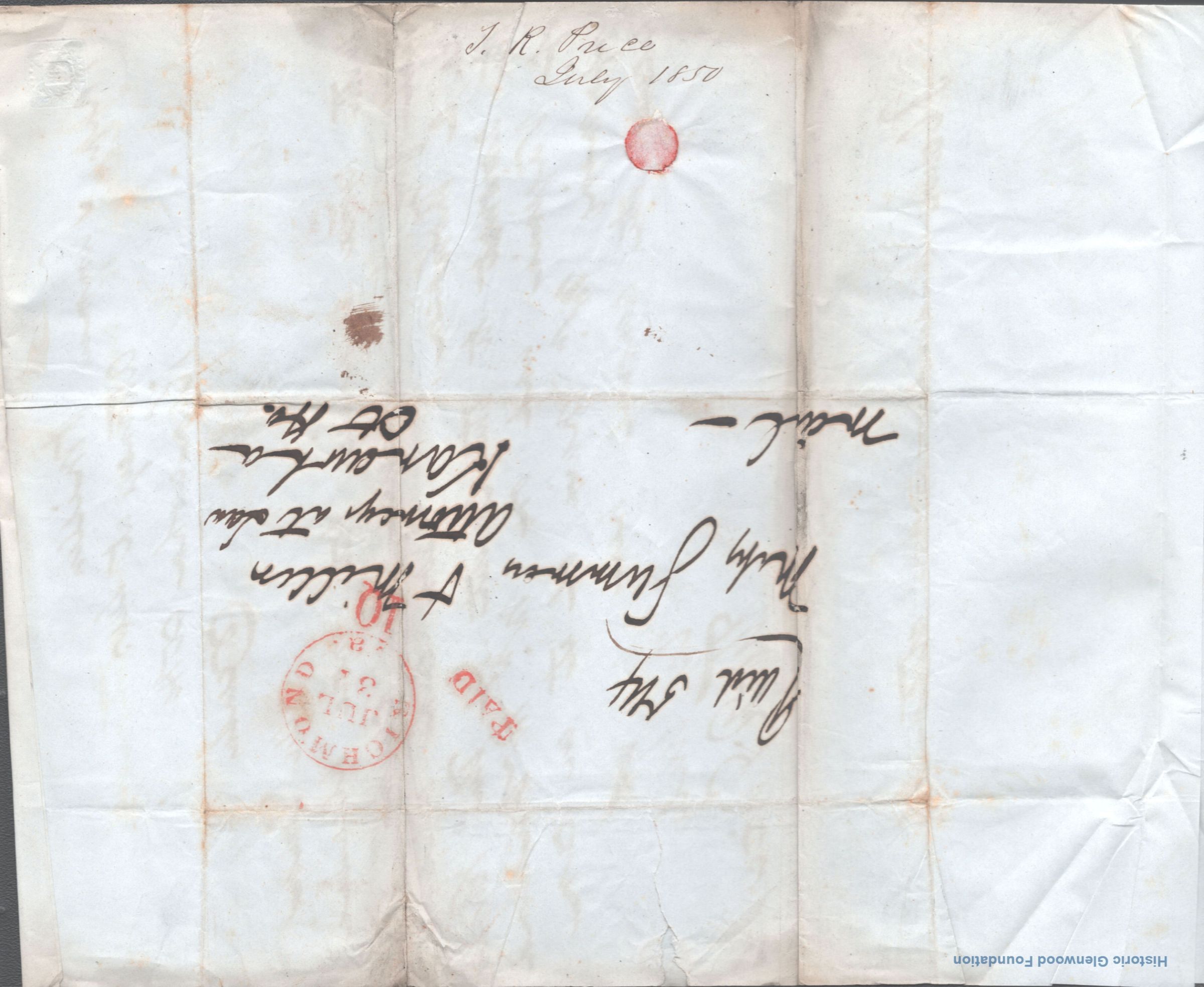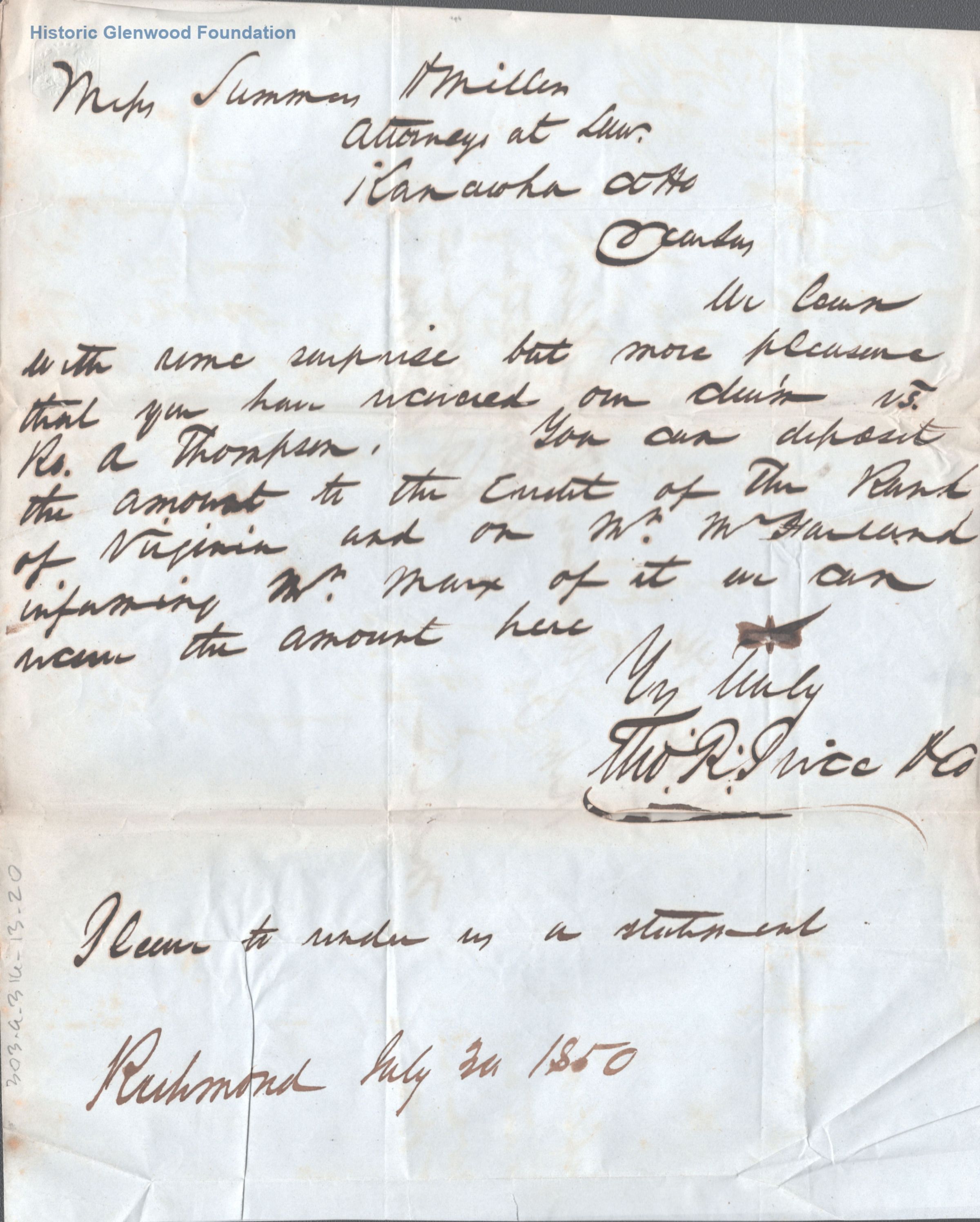 Correspondence from legal client of Summers & Miller: Thomas R. Price; July 30, 1850