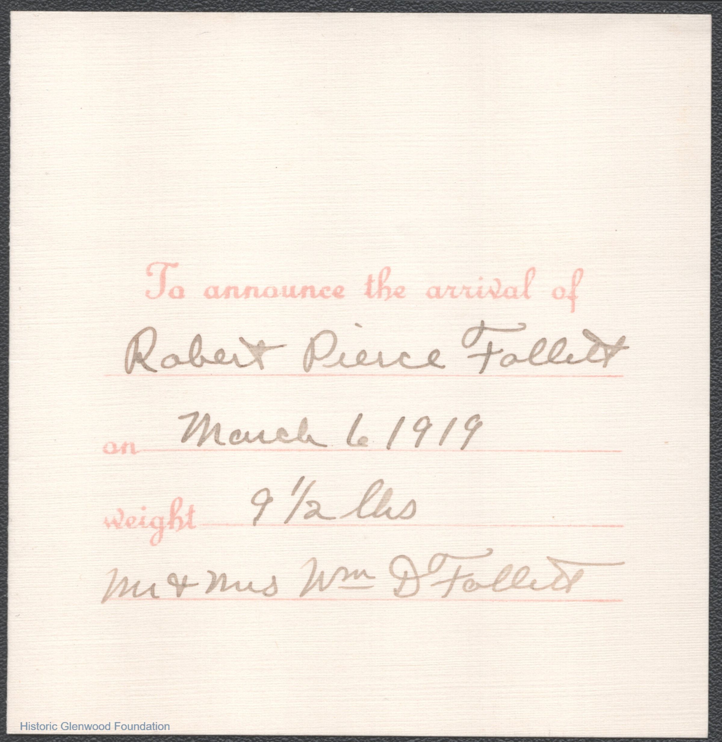 Birth announcement for Robert P. Follett, Mar 6, 1919.