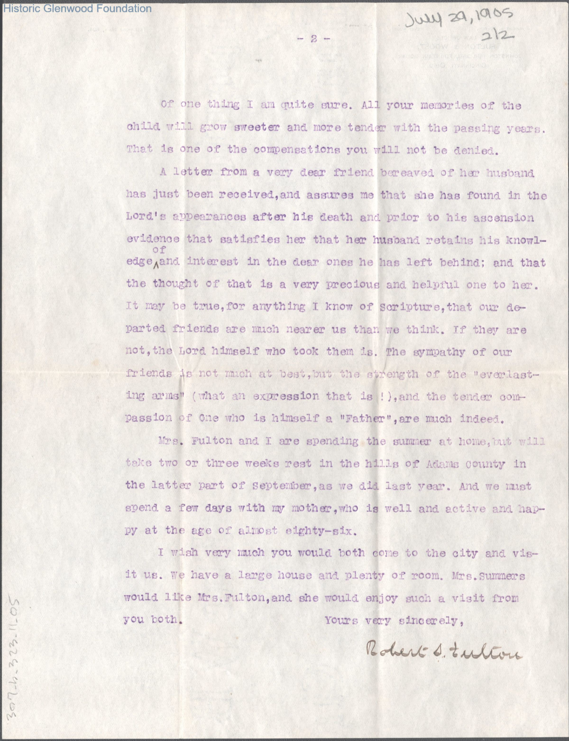 Two-page letter to Lewis & Lucy W. Summers from Robert S. Fulton, Jul 29, 1905.